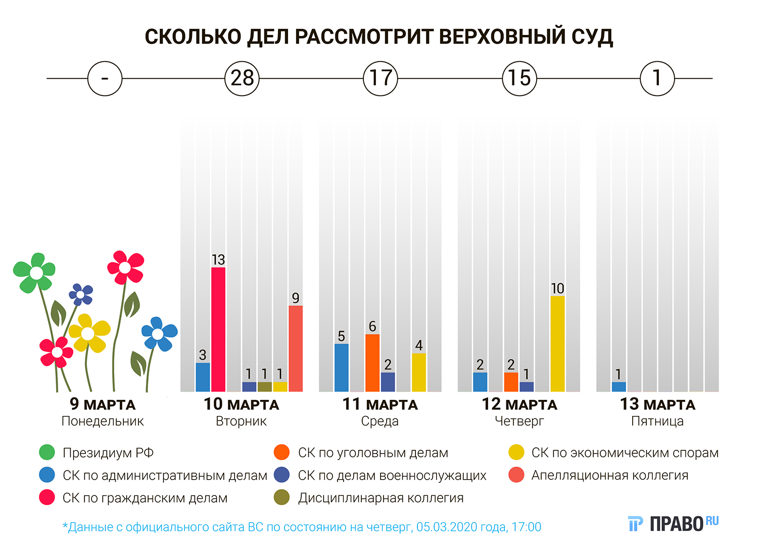 «Пустая» неделя в Президиуме ВС – он не рассмотрит ни одного дела. Одно дело назначено к рассмотрению в дисциплинарной коллегии, но информации об участниках процесса нет. Слушание «жалобы на решение ВККС и ККС о досрочном прекращении полномочий судей» состоится 10 марта (№ АПЛ20-1Д). Коллегия по делам военнослужащих рассмотрит четыре спора, а апелляционная – девять.