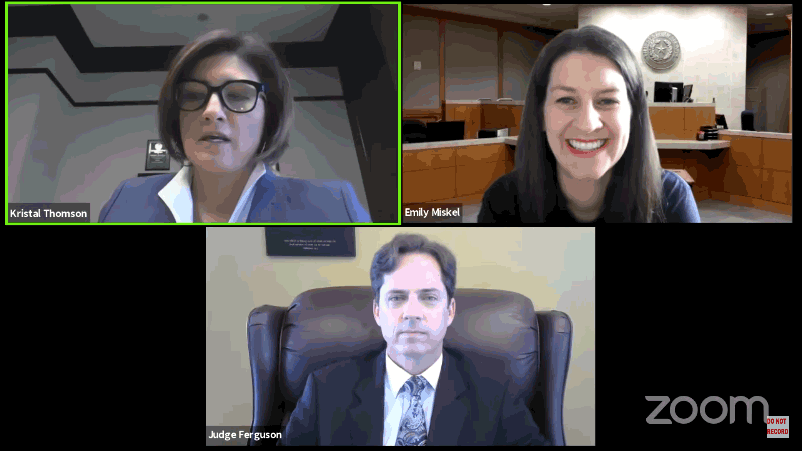 Активно внедряется система удалённого правосудия и в Техасе. 400 судей штата зарегистрировали свои учётные записи в Zoom. 23 марта для них прошёл вебинар, на котором судей учили настраивать программу, создавать YouTube-каналы, а также удаленно проводить судебные слушания и транслировать их в прямом эфире в интернете. В вебинаре даже давали советы о том, как одеваться для видеоконференции, как правильно расположить камеру, какой сделать фон для выступления, давали советы по освещению и т. д. За один день в штате умудрились провести 92 судебных заседания через Zoom.