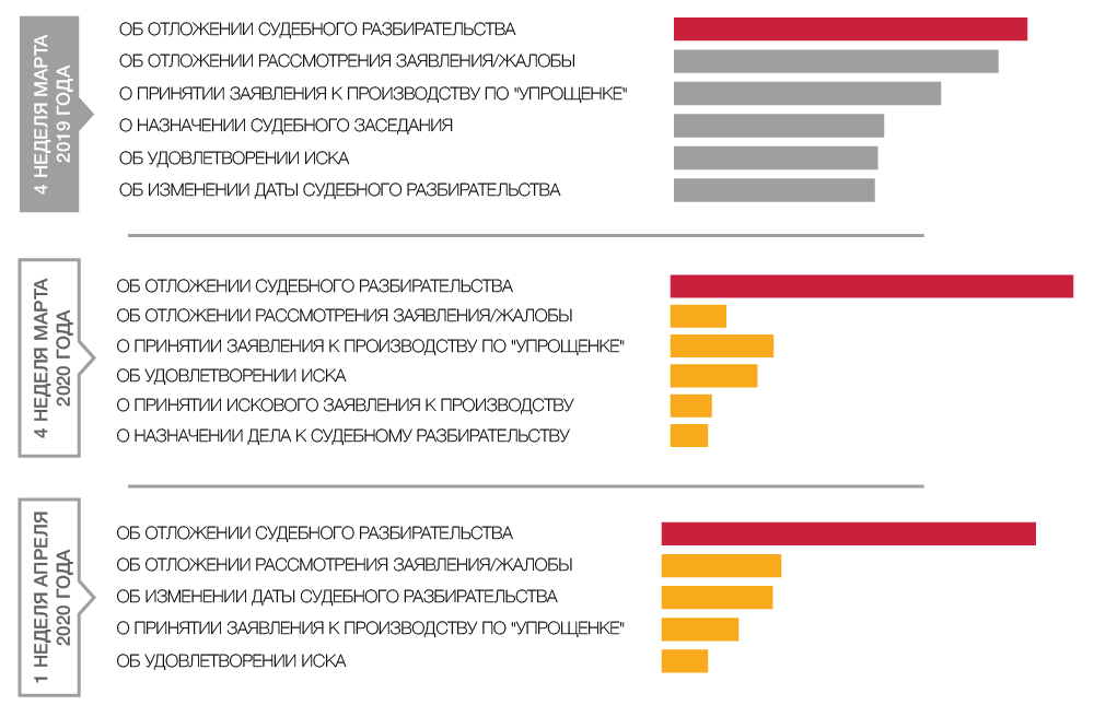 Как рассказал Александр Сарапин, исполнительный директор Pravo.Tech (разработчик сервиса «Картотека арбитражных дел»), согласно статистике картотеки, суды выполнили предписания и отложили несрочные заседания в условиях карантина Тем не менее с 23 по 27 марта арбитражные суды всех уровней и субъектов вынесли 111 000 определений об отложении судебного заседания. Для сравнения, за аналогичный промежуток в марте 2019 года (с 25 по 31 марта) таких определений было почти в четыре раза меньше – 31 800.