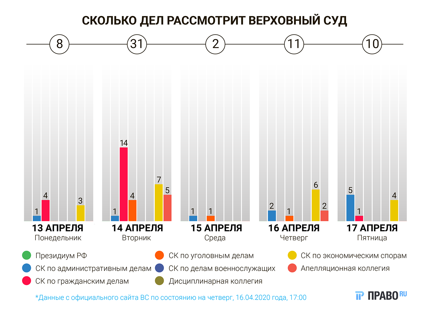 С 20 по 24 апреля Верховный суд планирует рассмотреть 62 дела. В Президиуме ВС, дисциплинарной коллегии и судебной коллегии по делам военнослужащих дел нет.