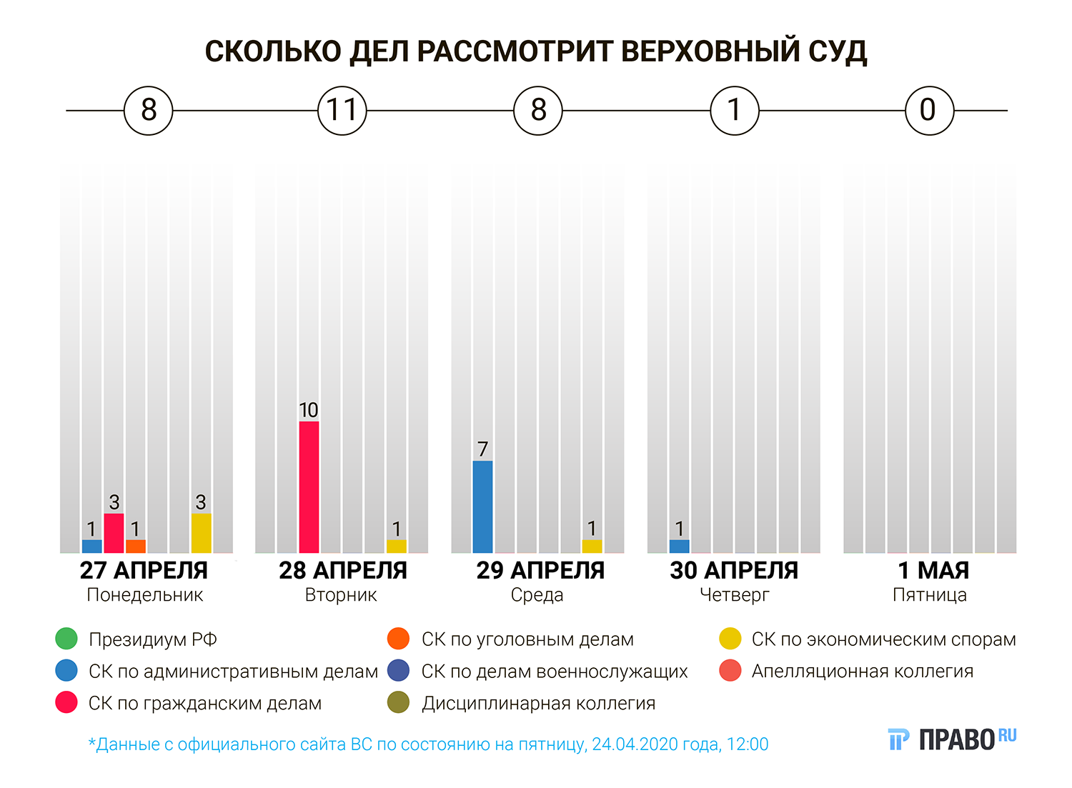 С 27 апреля по 1 мая Верховный суд планирует рассмотреть 28 дел. Экономколлегия разберется, обязательно ли реализовывать объекты социальной инфраструктуры на торгах в форме конкурса. Судебная коллегия по гражданским делам установит, может ли работодатель повесить на работника долг свыше его среднемесячного заработка. А уголовная коллегия пересмотрит приговор банде из Воркуты.
