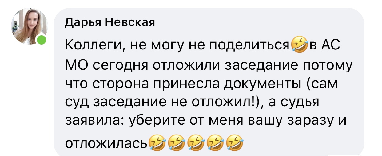 Владислав Варшавский, управляющий партнёр Варшавский и партнеры В Северной столице вышла неразбериха. Формально суды общей юрисдикции Санкт-Петербурга до конца месяца продлили ограниченный режим работы, который действовал ранее. Об этом заявили в объединенной пресс-службе судов города и сослались на продление карантинных мер правительством Петербурга. Но на практике некоторые петербургские суды начали работать, рассказали местные юристы. Адвокат Елена Ракова выложила фото очереди из Московского районного суда Санкт-Петербурга. Функционирует и Всеволожский городской суд Ленинградской области, куда впускают за 10 минут до начала заседания, рассказал адвокат Павел Астапенко.