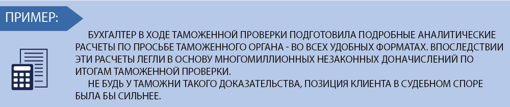 Перед любым контролером стоит задача добиться доначислений, привлечь к ответственности или придумать другой способ, чтобы пополнить бюджет. Никакой другой цели нет - надо принять это как факт, советует Курмамбаева. Клиенту же надо не помогать проверяющим, а формировать в ходе проверки правильную доказательственную базу для будущего спора: "Любой документ должен оцениваться с точки зрения полезности в суде, а не для укрепления дружеских отношений с налоговой или таможней."