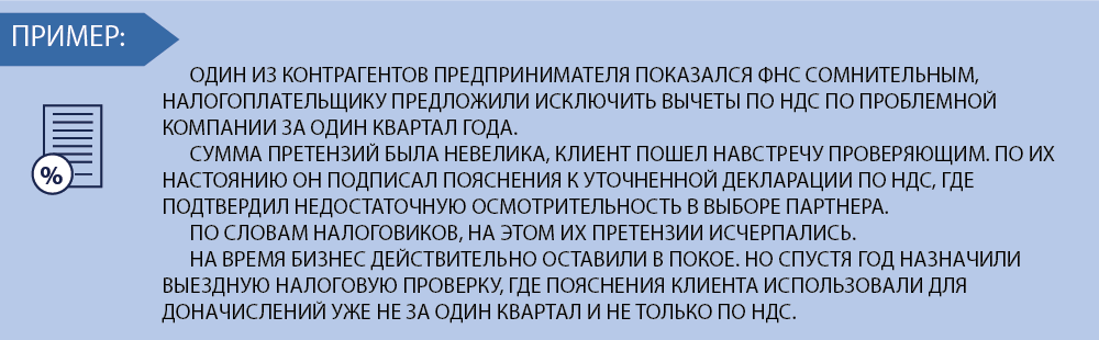 Еще одна плохая идея - пытаться решить проблему околозаконными методами и "договориться" с проверяющими. "Речь здесь не столько о коррупции, сколько о соглашении признать часть нарушений и не оспаривать их в суде взамен на гарантию прекращения преследования по другим эпизодам", - говорит Курмамбаева из Intellect . Пользы от таких соглашений мало: единожды дав слабину, предприниматель попадает список "постоянных клиентов" фискального органа, ежегодно проверяется и вынужден снова и снова идти на сделку.