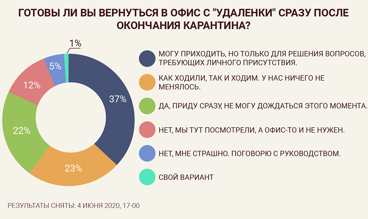 36,7% респондентов готовы выходить из домашнего режима только в случае необходимости присутствовать лично. Часть компаний уже начинает работу в офисах: «Мы частично вышли из дистанционки с 12 мая. Начали с юристов и сотрудников, у которых есть личный автотранспорт, – делится директор по развитию Юлия Надёжина. – Закупили необходимые дезинфицирующие средства, маски, перчатки. Все мы перед выходом в офис сдали тесты, чтобы не подвергать друг друга рискам заражения. Но для посетителей офисы по-прежнему закрыты, все встречи проходят дистанционно».