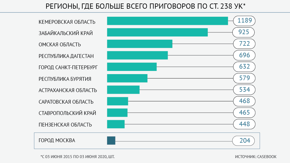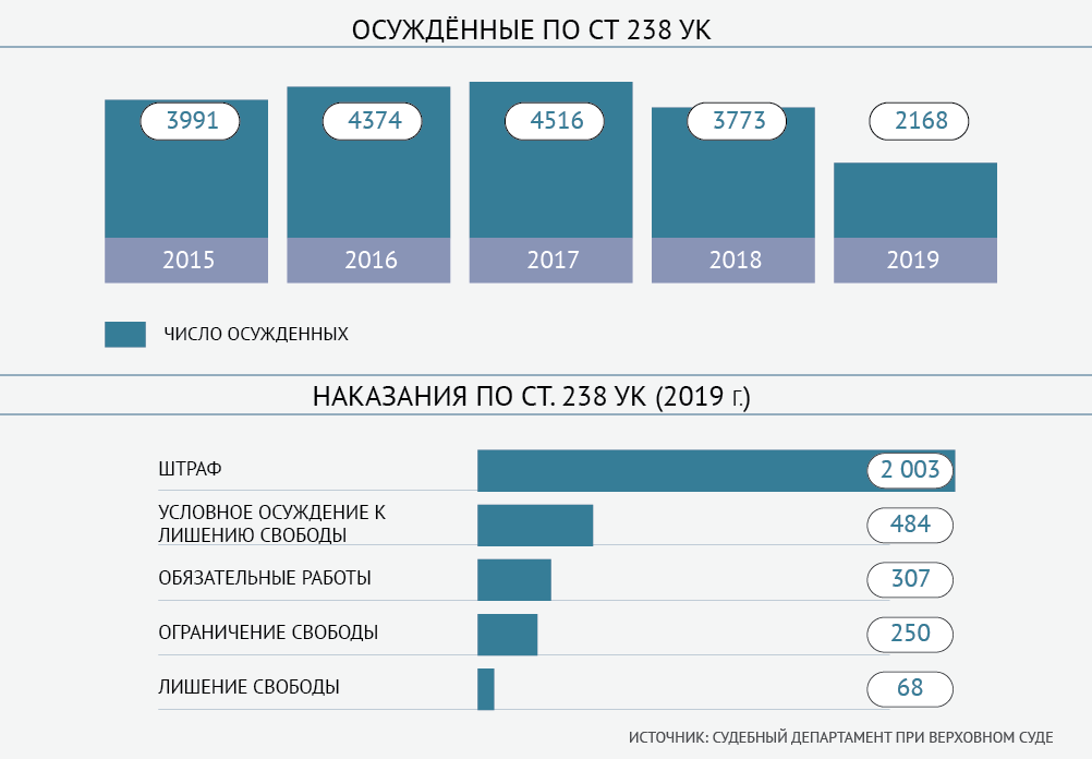 Впрочем, как показывает статистика Суддепа, число осужденных по ст. 238 УК уже два года падает. В 2019 году их оказалось в два раза меньше, чем в 2017-м (2168 против 4516). Возможно, что на статистике 2019-го сказались в том числе разъяснения Пленума ВС, принятые в середине года.