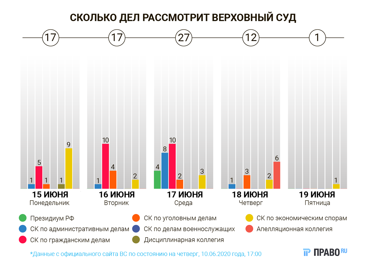Всего на этой неделе Верховный суд рассмотрит 72 дела. В гражданской коллегии рассмотрят дело о сносе разрешенного здания. Экономколлегия разберется с привлечением к субсидиарной ответственности авторов очередной схемы по выводу активов из предприятия. А административная коллегия по иску Минюста ликвидирует «ненастоящую» партию «Россия Будущего».
