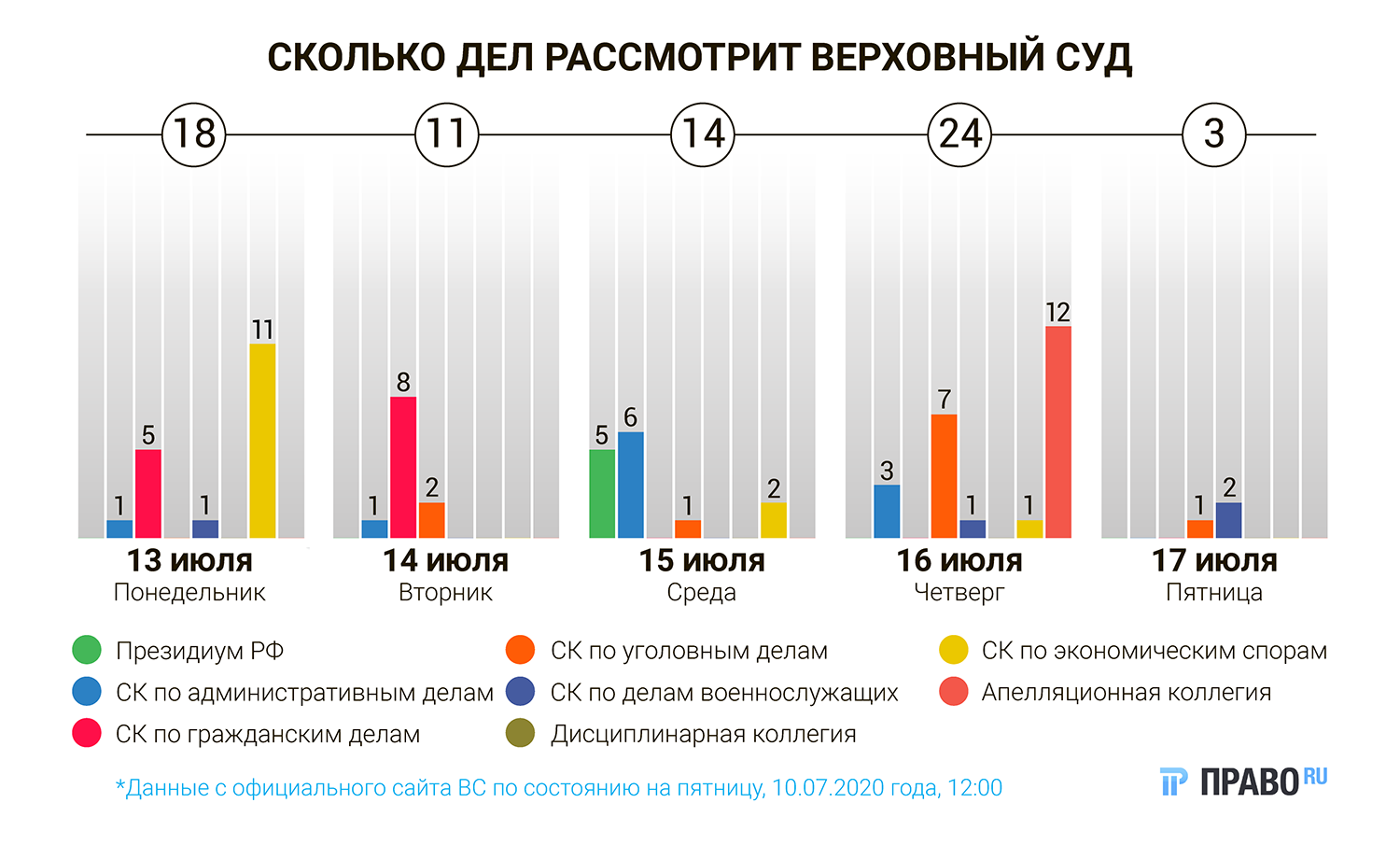 Новая неделя – новые дела в Верховном суде. С 13 по 17 июля их будет 70. Президиум ВС пересмотрит громкое дело об убийстве руководителей Московской областной нотариальной палаты, а уголовная коллегия займется делами бывших судей. Экономколлегия разберется, можно ли взыскать с Федеральной антимонопольной службы расходы на авиабилеты для юристов-представителей, а гражданская коллегия разберет спор о долге за оказание юридических услуг.
