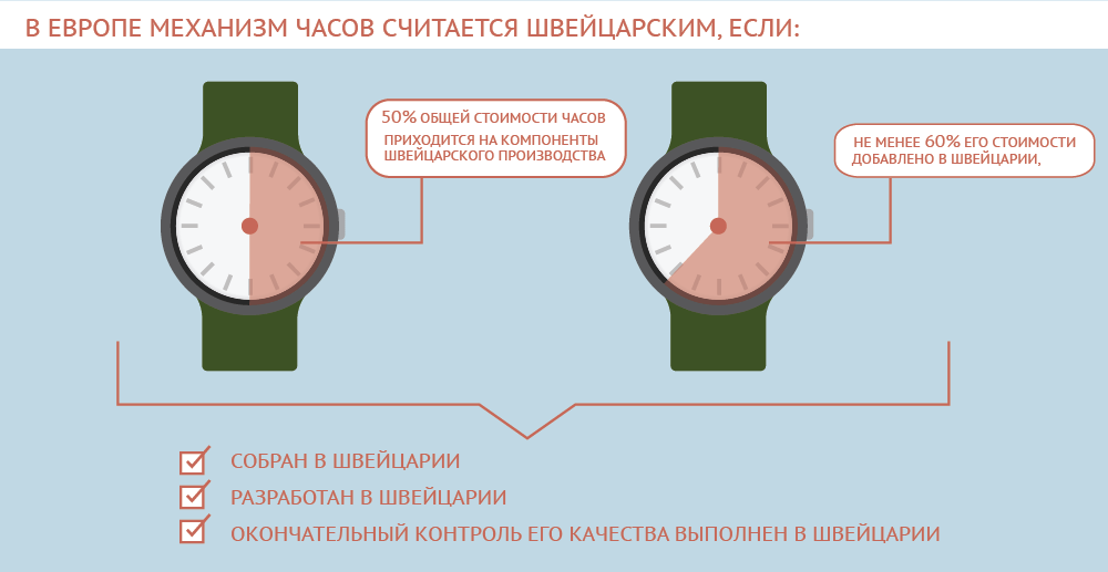 «Пока что, если говорить о географических указаниях, можно приводить лишь отдельные примеры. – говорит Лабзин. – Так, в Европе механизм часов считается швейцарским, если он одновременно собран в Швейцарии, разработан в Швейцарии, окончательный контроль его качества выполнен в Швейцарии, не менее 60% его стоимости добавлено в Швейцарии, на компоненты швейцарского производства приходится не менее 50% общей стоимости часов».
