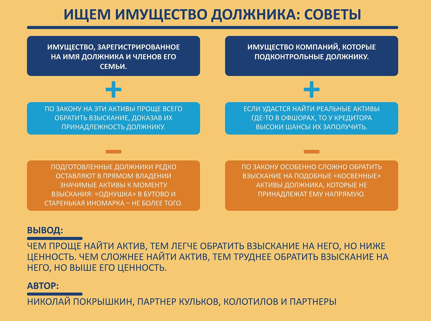 В первую очередь кредиторы пытаются найти у должника деньги на российских и иностранных счетах – самые ликвидные, а потому наиболее разыскиваемые активы. Также ищут квартиры, дома и машины. Сделки по ним обычно оставляют следы, так как отражаются в госреестрах. По словам Петрова, в последнее время кредиторы все чаще пытаются искать у своих оппонентов дорогостоящую недвижимость за границей. Особую ценность представляют и счета, открытые в иностранных банках, добавляет партнер КА Ковалев,Тугуши и партнеры Сергей Кислов. «Не всегда их просто найти, но арест по ним может быть быстрым. Следовательно, неожиданным для должника и эффективным для взыскателя».