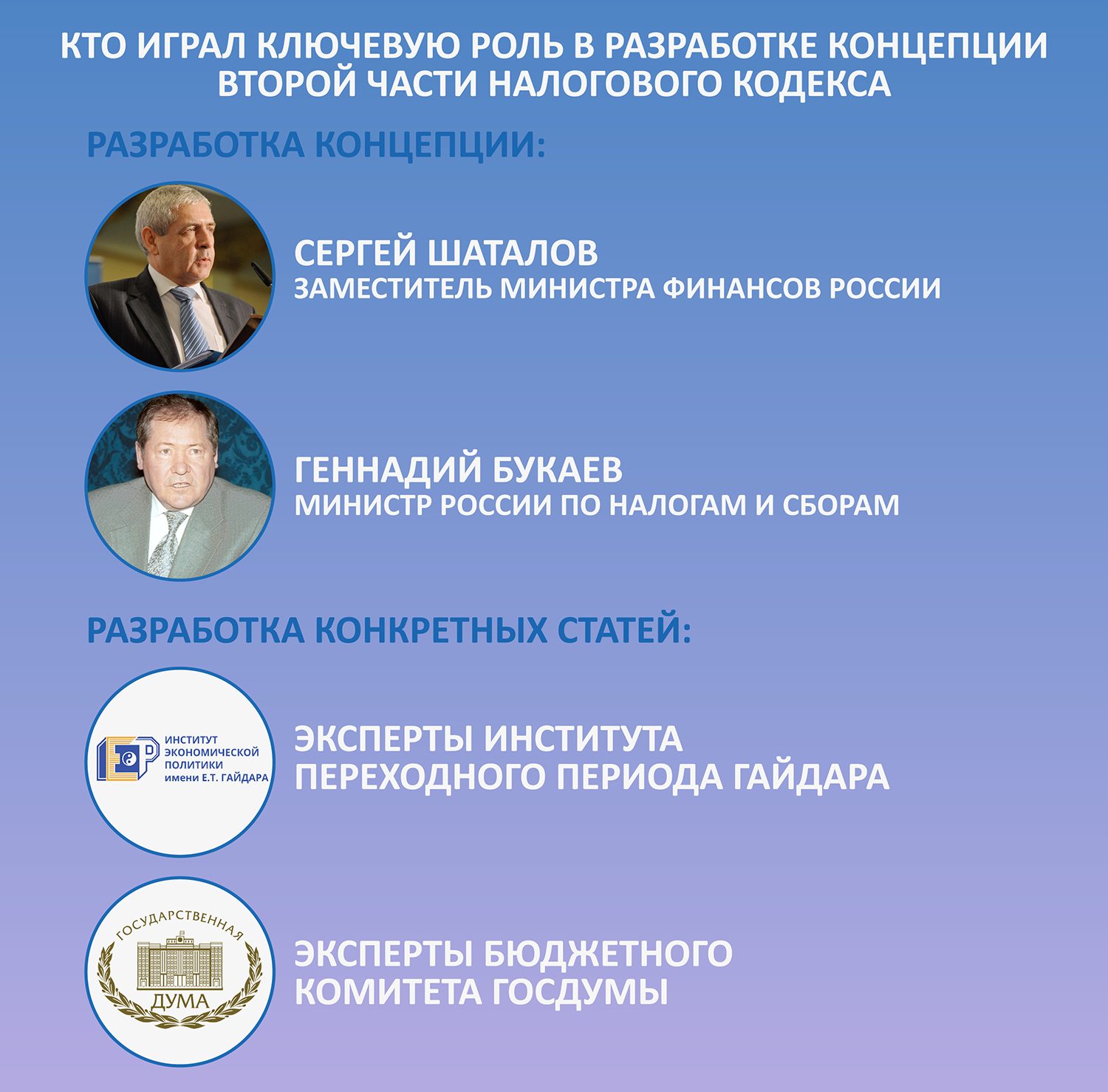 Ч. 2 Налогового кодекса началась с разработки четырех глав: «НДС», «Акцизы», «Единый социальный налог» и «НДФЛ». Задача была непростой, утверждает Орлов. По его словам, им с коллегами предстояло не просто кодифицировать налоговое законодательство, а переработать юридические составы налогов, чтобы они: