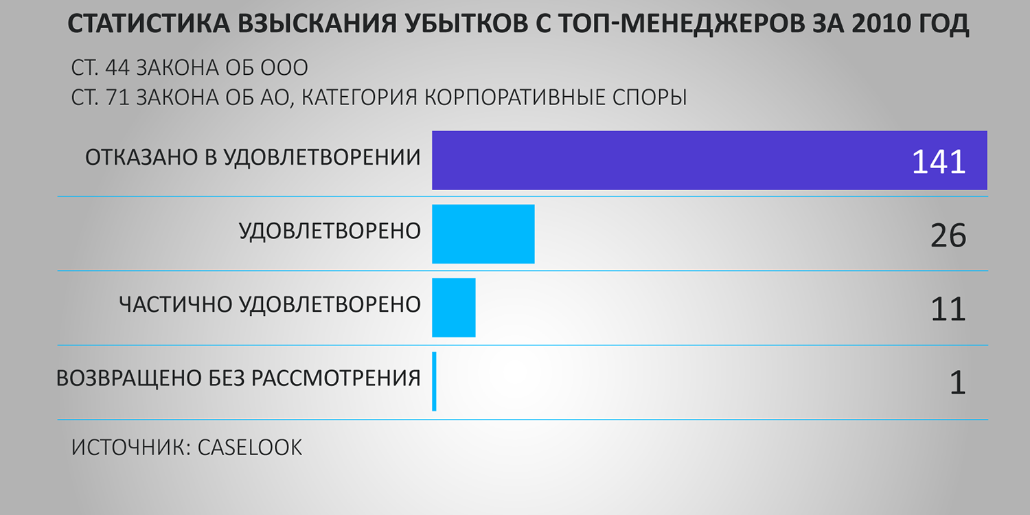 10 лет назад директоров к ответственности привлекали крайне редко. В основном за примитивные и грубые нарушения, считает Юлия Михальчук, советник Saveliev, Batanov & Partners . В 2010 году существовали нормы, регулирующие ответственность руководителя организации (ст. 44 закона об ООО и ст. 71 закона об АО), но привлечь к ней было достаточно сложно, считает Станислав Соболев, внешний консультант Mikhailov & Partners Private Services Group.