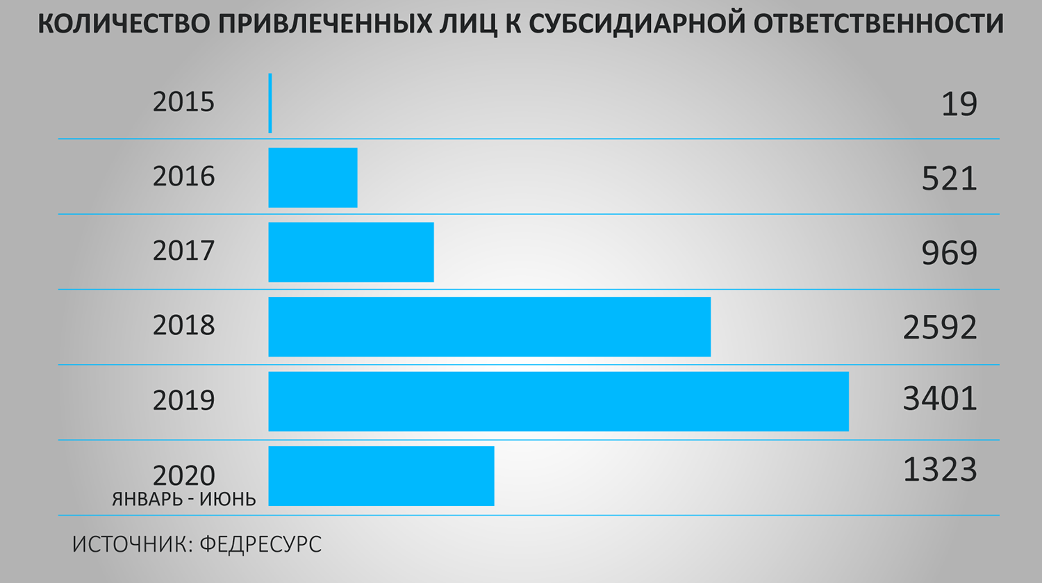 Подход законодателя начал ужесточаться для защиты интересов кредиторов, пострадавших от недобросовестных топ-менеджеров, считает Кононов. По словам эксперта, судебная практика продолжает следовать по пути усиления прокредиторской направленности, а КДЛ все чаще привлекаются к субсидиарной ответственности. Такую статистику «Федресурс» ведет с 2015 года. Из этих данных видно, что за последние пять лет число привлеченных к ответственности выросло в разы.