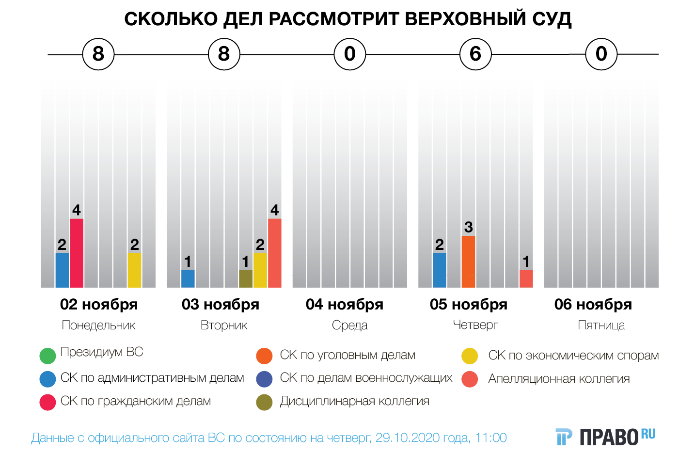 Ноль дел в коллегии по делам военнослужащих. Не будет рассматривать дела и Президиум ВС, который всегда заседает по средам, потому что в среду, 4 ноября, россияне будут праздновать День народного единства.