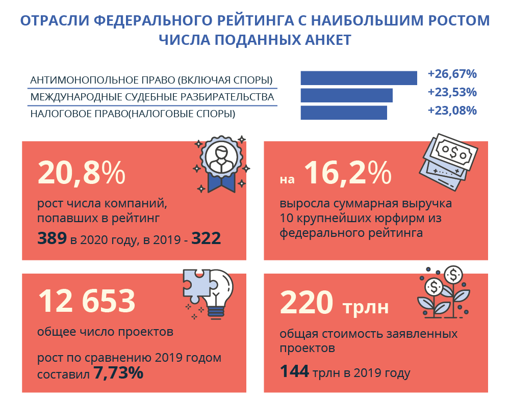 Основным событием для юридического рынка в 2020 году, как и для практически всех отраслей экономики, стала пандемия коронавируса. Именно она и ее последствия определили текущее состояние отрасли и направления развития для игроков рынка. Последствия оказались, вопреки прогнозам, не такими катастрофическими. «Бизнесу юристы нужны всегда. Выбирают тех, кто готов в самый сложный момент предложить правильные и нестандартные решения», – говорит Дмитрий Афанасьев, председатель комитета партнеров АБ Егоров, Пугинский, Афанасьев и партнеры . По данным, которые компании подали в рейтинг «Право.ru», суммарная выручка 10 крупнейших юрфирм из федерального рейтинга в 2020 году выросла на 16,2% по сравнению с 2019 годом.