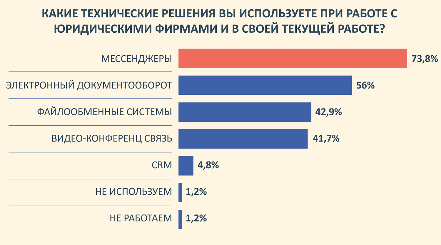 И тут на помощь клиентам и юристам приходят мессенджеры – согласно результатам опроса, при организации своей текущей работы и общения с консультантами их используют три из четырех респондентов. Также прочные позиции у электронного документооборота и файлообменных систем – их используют половина опрошенных. Популярна и видео-конференц-связь.