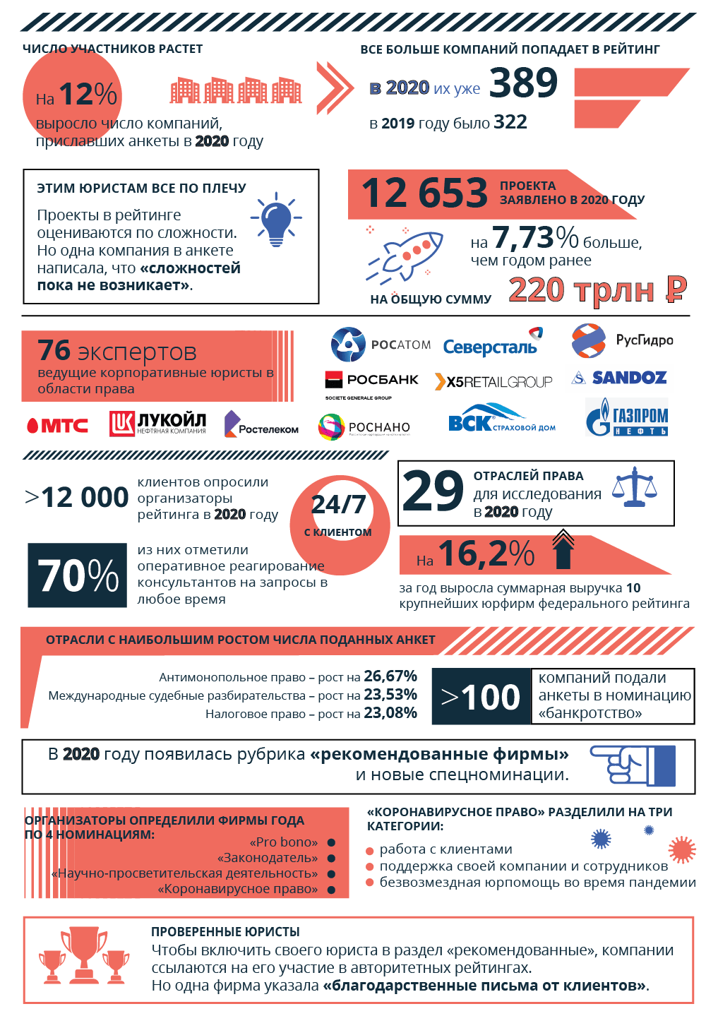 2020 год подходит к концу (и хорошо), а мы в "Право.ru " подводим итоги очередного рейтинга "Право-300". Его результаты вдохновляют смотреть на будущее юридического рынка с некоторым оптимизмом. Претенденты посылают все больше анкет, и все больше фирм попадает в рейтинг. Растет число и стоимость проектов. Интересные цифры и факты о рейтинге - в инфографике.