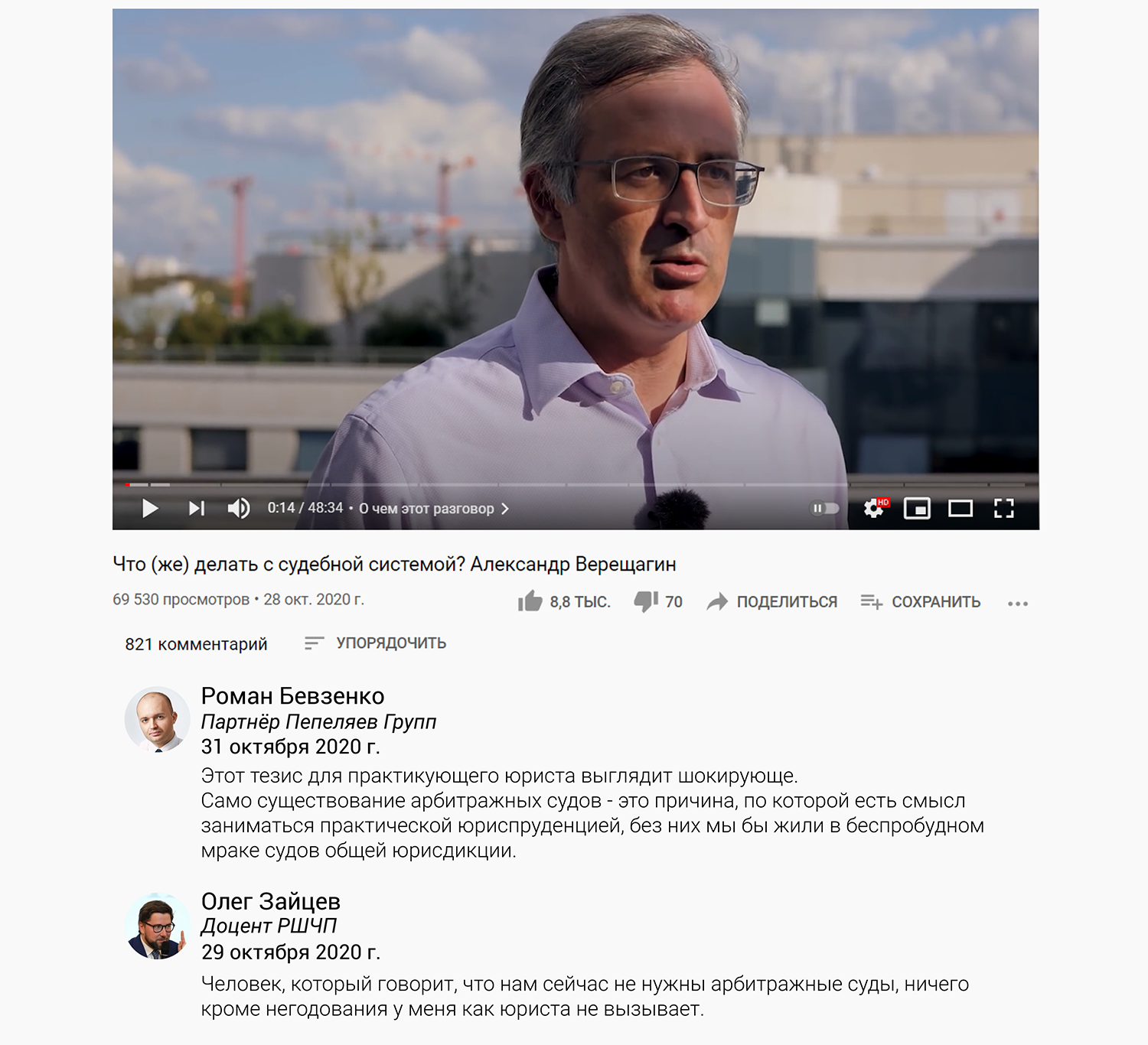 Не меньшие споры вызвало предложение отказаться от системы арбитражных судов, которую озвучил доктор права, главный редактор журнала «Закон» Александр Верещагин. «Они [арбитражные суды] выполнили свою историческую роль», – сказал он в интервью Сергею Гуриеву. Многие пользователи Facebook не согласились с Верещагиным.