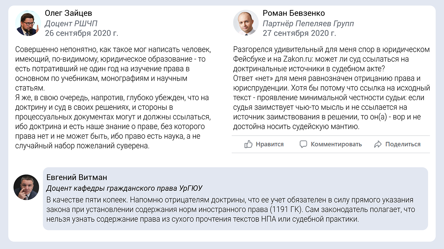 Дискуссия в Facebook развернулась вокруг ссылок российских судов на доктрину. Юристы задались вопросом: могут ли судьи подкреплять свои выводы в мотивировочной части решений мнениями ученых-правоведов?