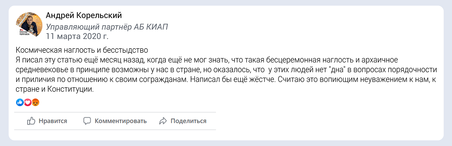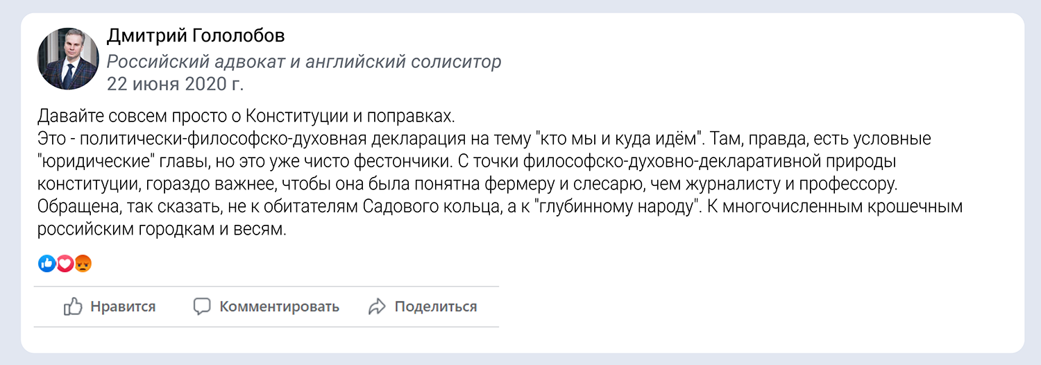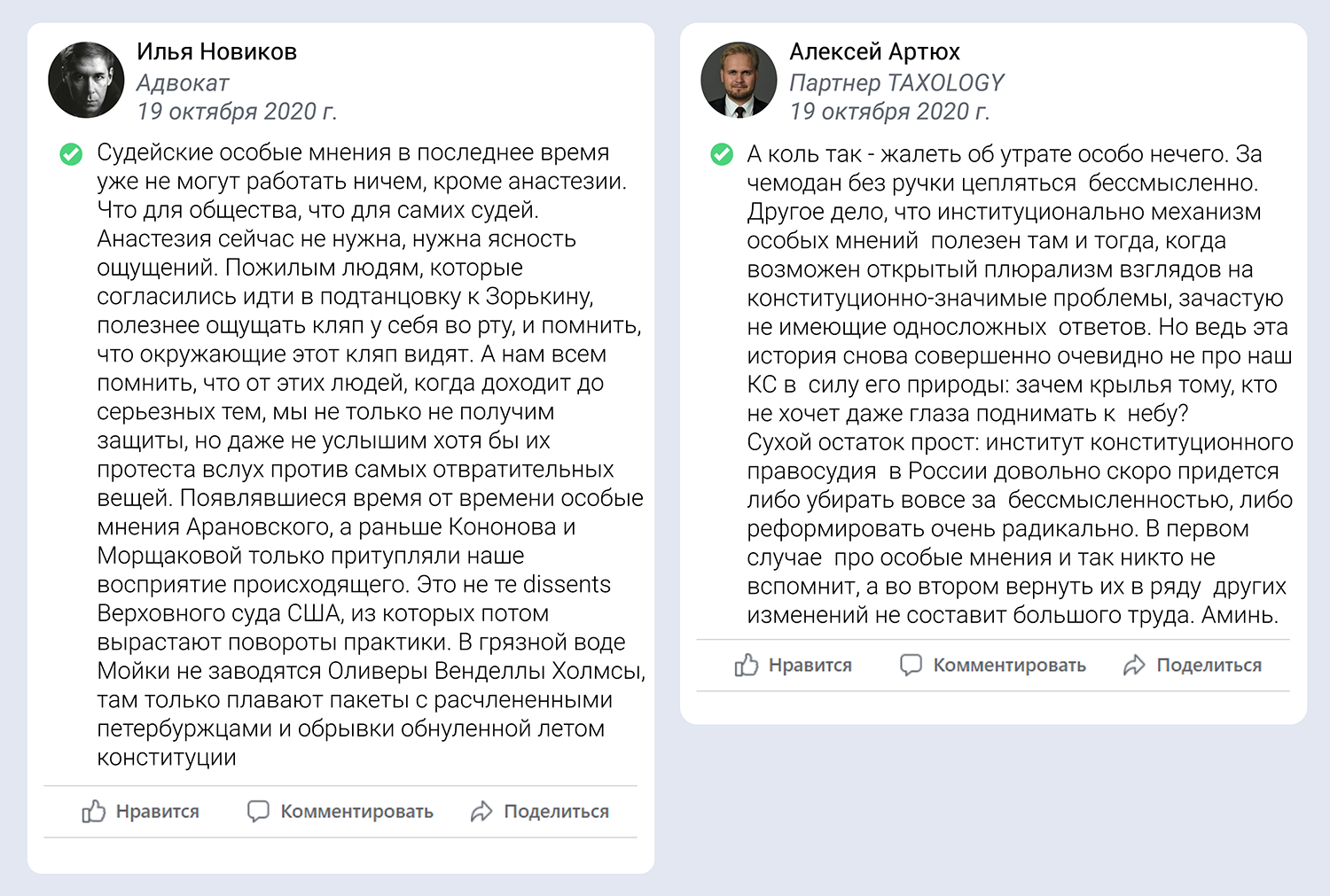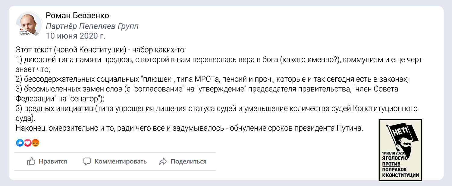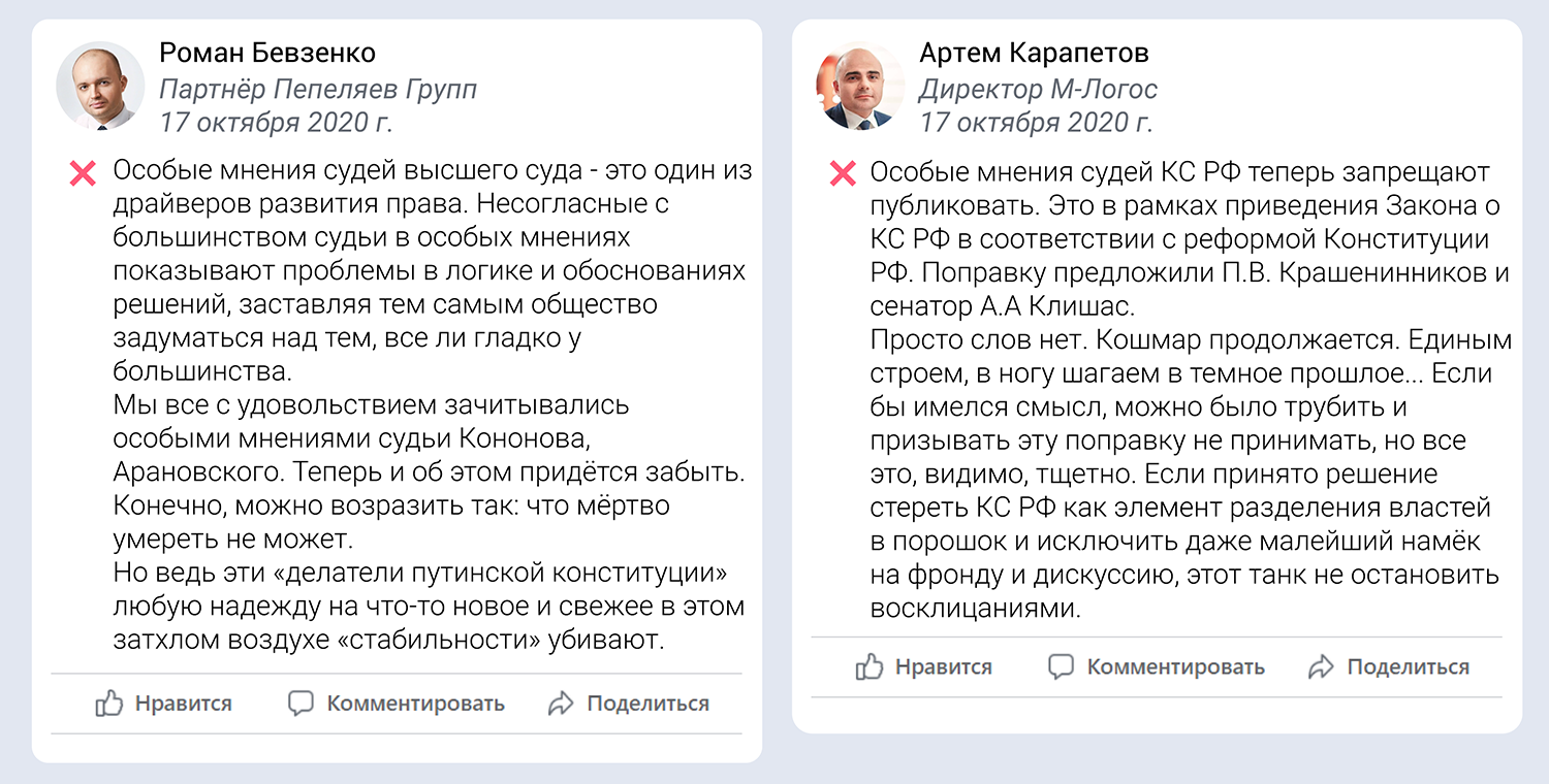 В соцсетях юристы высказываются более прямолинейно, чем в официальных комментариях для прессы. Самый большой резонанс вызвали поправки к Конституции. Одни называли их «дикостью» и «бессодержательными социальными плюшками», другие в ответ выставляли аватарки «За поправки». Но юристов интересует все: спорили о коронавирусных мерах господдержки, можно ли судьям ссылаться на научную доктрину в судебных решениях и нужно ли лишить статуса ефремовских адвокатов. Почитали Facebook и заскринили самые яркие моменты. Чтобы увидеть все дискуссии под постами целиком, кликайте на картинки в тексте.
