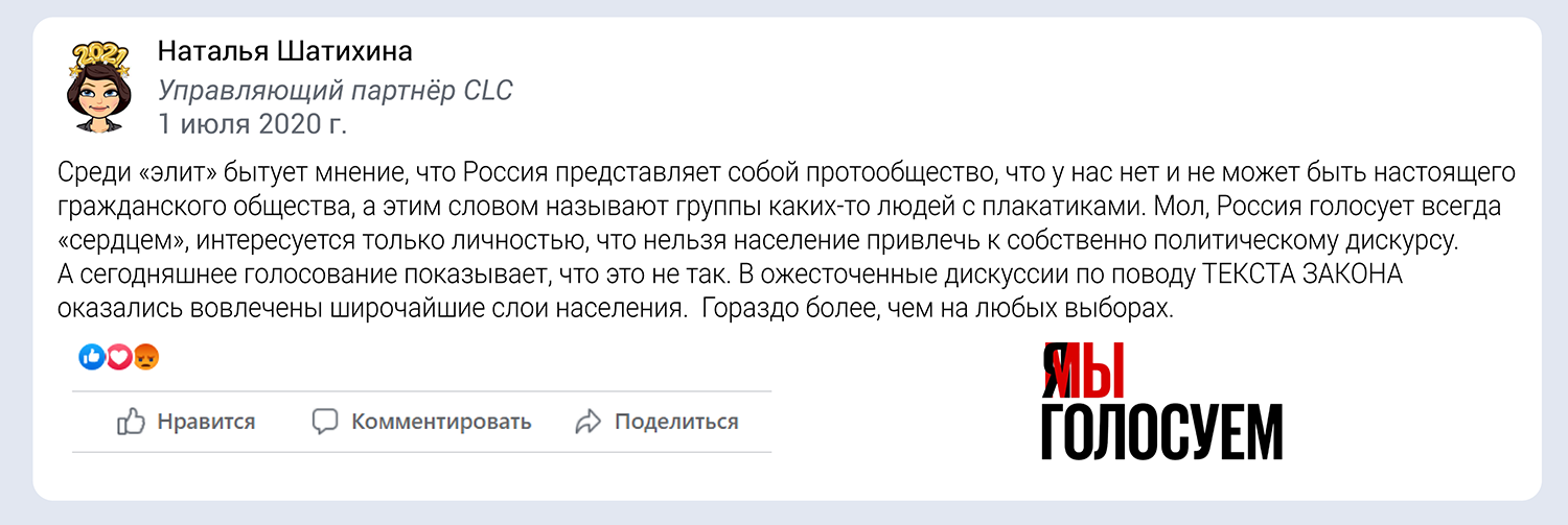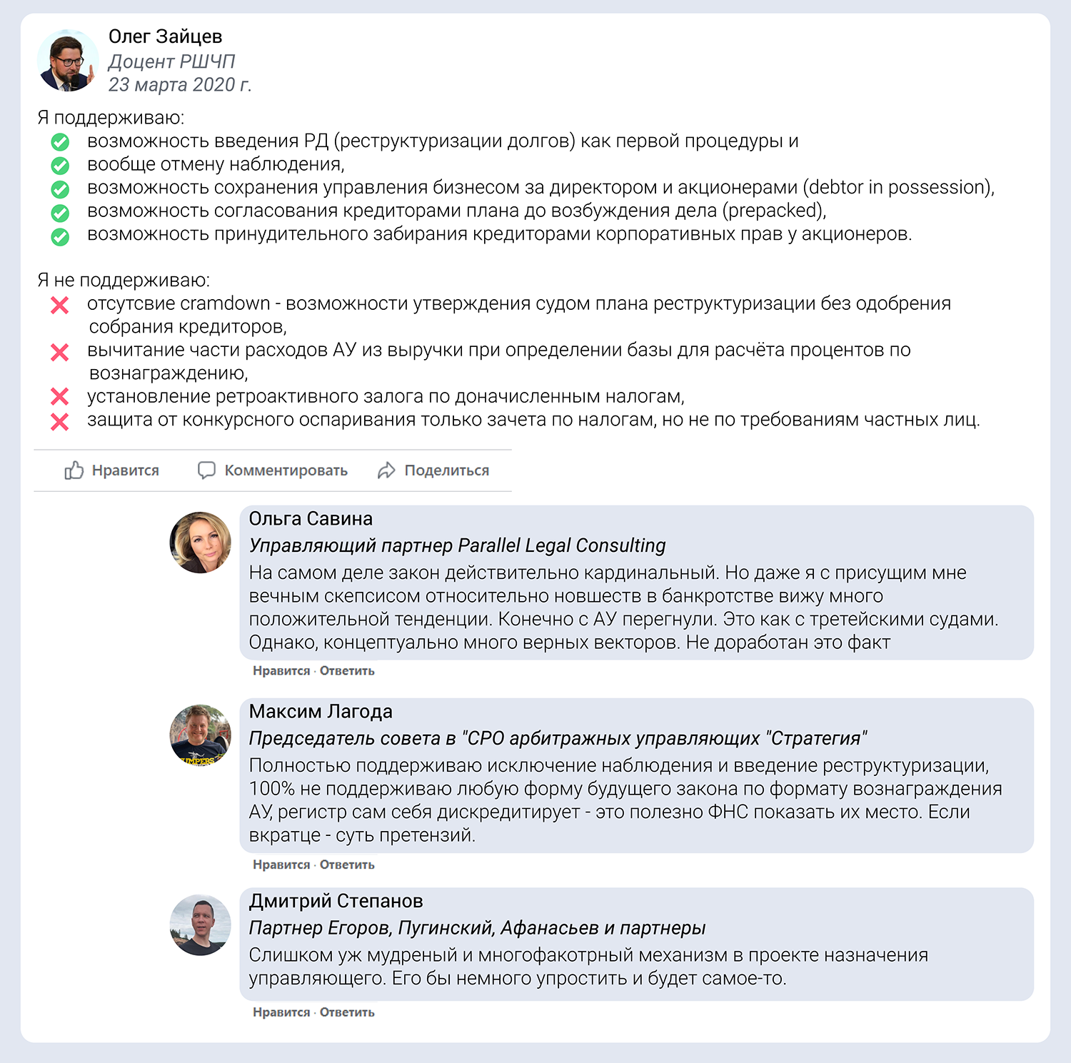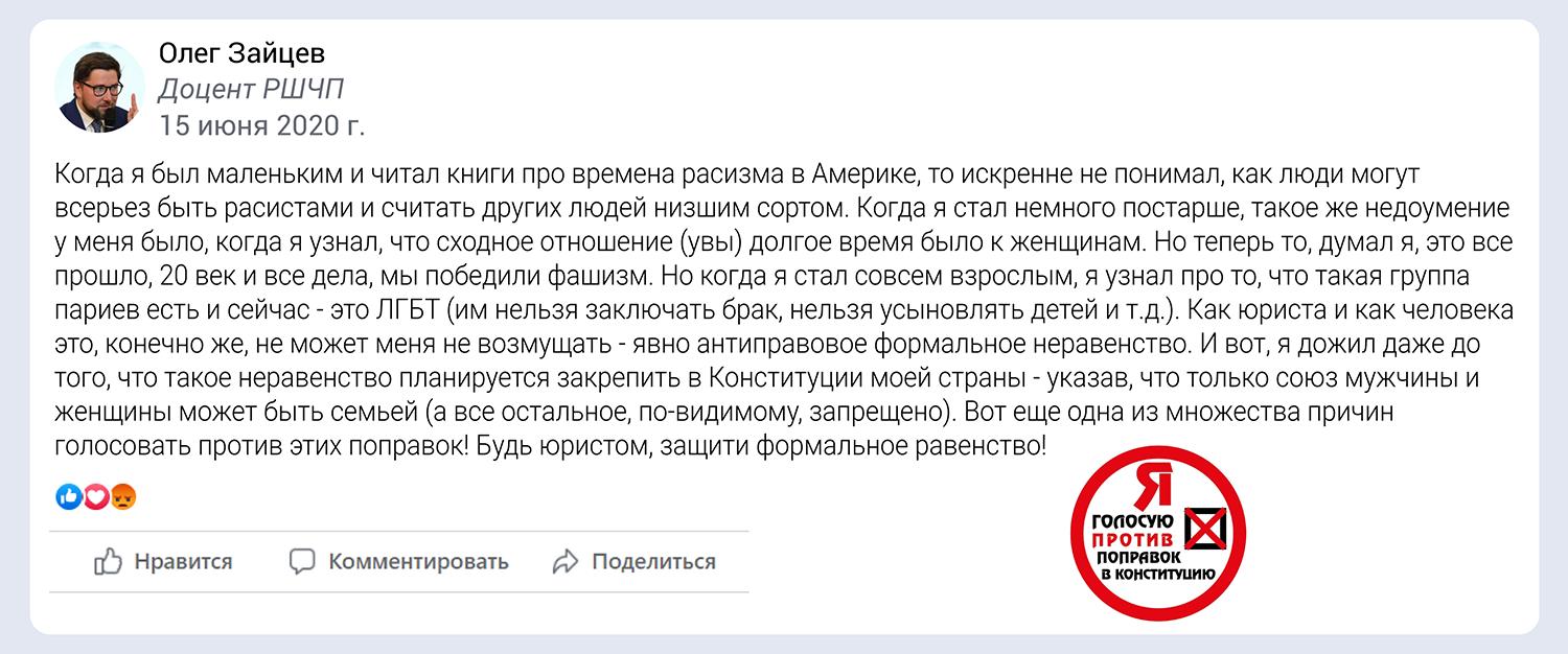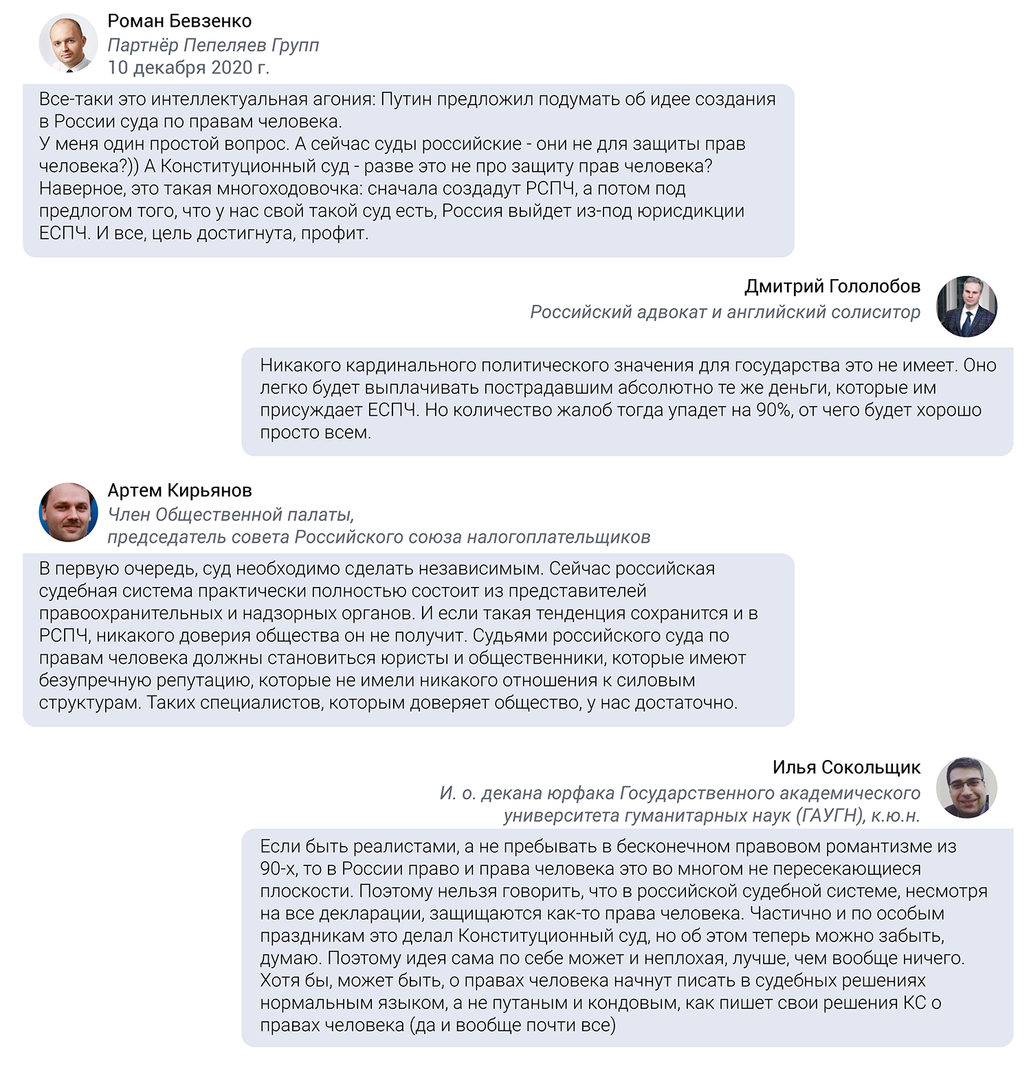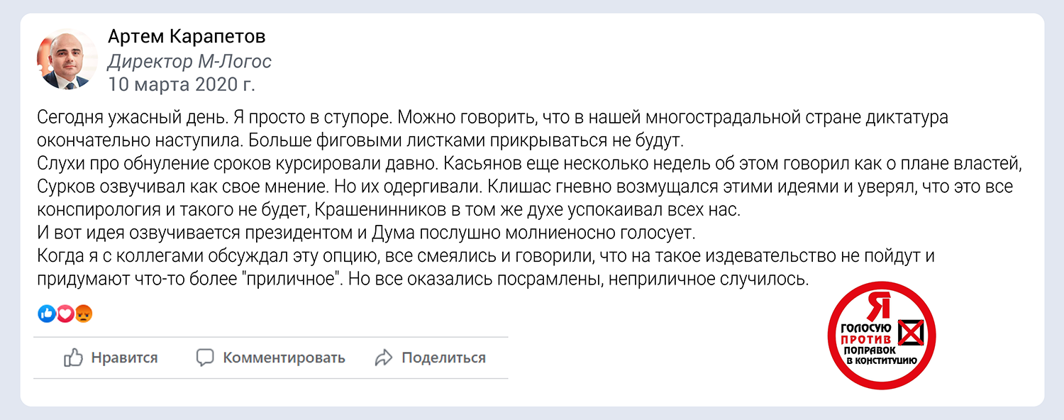 В соцсетях юристы высказываются более прямолинейно, чем в официальных комментариях для прессы. Самый большой резонанс вызвали поправки к Конституции. Одни называли их «дикостью» и «бессодержательными социальными плюшками», другие в ответ выставляли аватарки «За поправки». Но юристов интересует все: спорили о коронавирусных мерах господдержки, можно ли судьям ссылаться на научную доктрину в судебных решениях и нужно ли лишить статуса ефремовских адвокатов. Почитали Facebook и заскринили самые яркие моменты. Чтобы увидеть все дискуссии под постами целиком, кликайте на картинки в тексте.