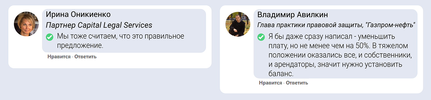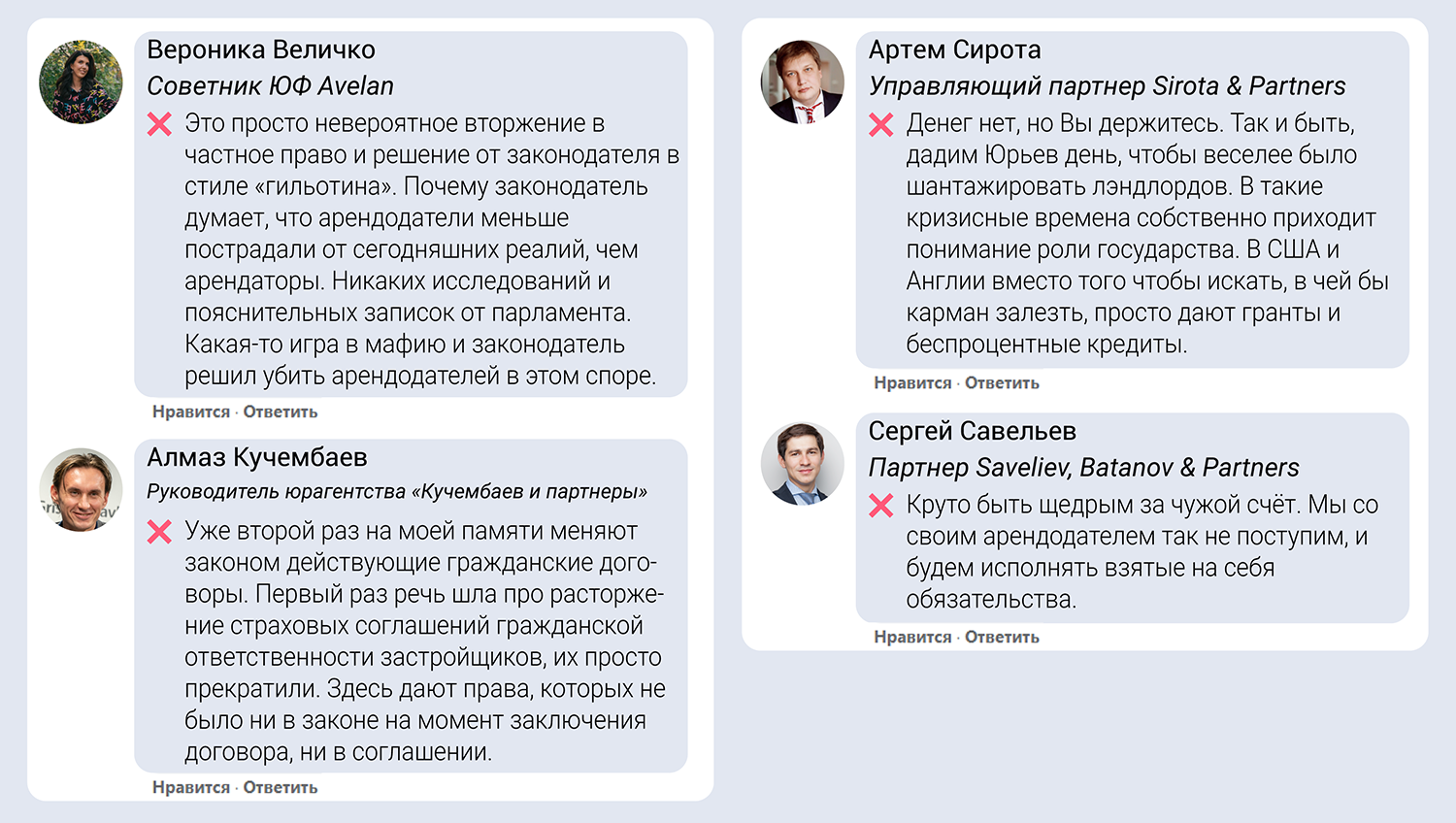 Немало споров в соцсетях развернулось вокруг пандемийного законодательства. Многие правила пришлось спешно менять из-за того, что большинство сфер перешло в онлайн. Новеллы коснулись и арендных отношений. Малому и среднему бизнесу из наиболее пострадавших отраслей разрешили не только требовать уменьшения арендной платы на срок до года, но и отказываться от договора после 14 дней безуспешных переговоров. Правда, крупным предприятиям такие поблажки никто не дал. Юристы подобную поддержку оценили неоднозначно. Одни ее резко раскритиковали.