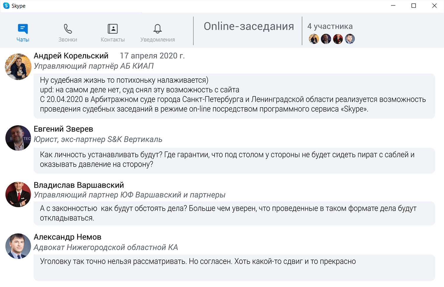 О переходе на онлайн-заседания уже 21 апреля сообщил Верховный суд. В тот же день он рассмотрел первое «виртуальное» дело о признании членом семьи военнослужащего. А через неделю возможность рассматривать споры онлайн появилась в картотеке арбитражных дел. Первым к специальной системе подключился АС Ямало-Ненецкого автономного округа. 28 апреля он с помощью КАД рассмотрел дело о привлечении арбитражного управляющего к административной ответственности. Уже на следующий день президиумы Верховного суда и Совета судей рекомендовали судам до 11 мая перейти на «виртуальные» заседания.