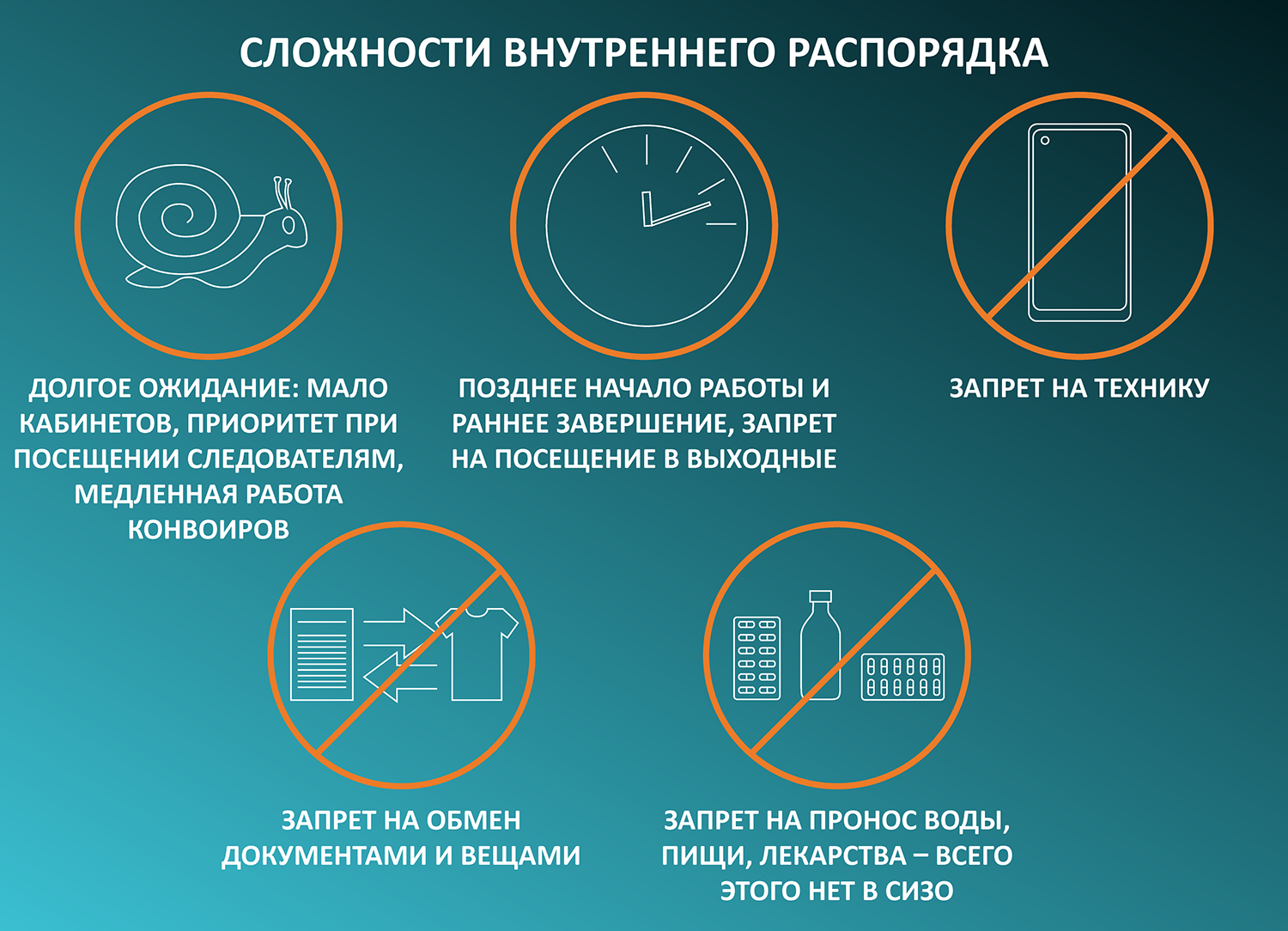 Попасть на свидания можно только в ограниченное время – с 10 до 15 или 17 часов, с перерывом на обед. А в выходные СИЗО закрыты для посещений. Это, по словам Эйсмонт, довольно существенная проблема: «Большой помощью для адвокатов было бы открытие изоляторов в выходные – для тех, кто готов работать в эти дни».