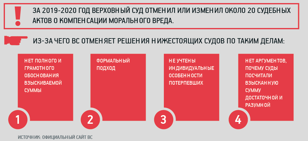 В споре № 66-КГ20-4-К8 ВС снова запретил ограничиваться общими фразами судам, которые обосновывают размер компенсации. Надо оценивать конкретные обстоятельства: возраст, семейное положение, наличие детей, состояние здоровья, утрату семейных связей и так далее.
