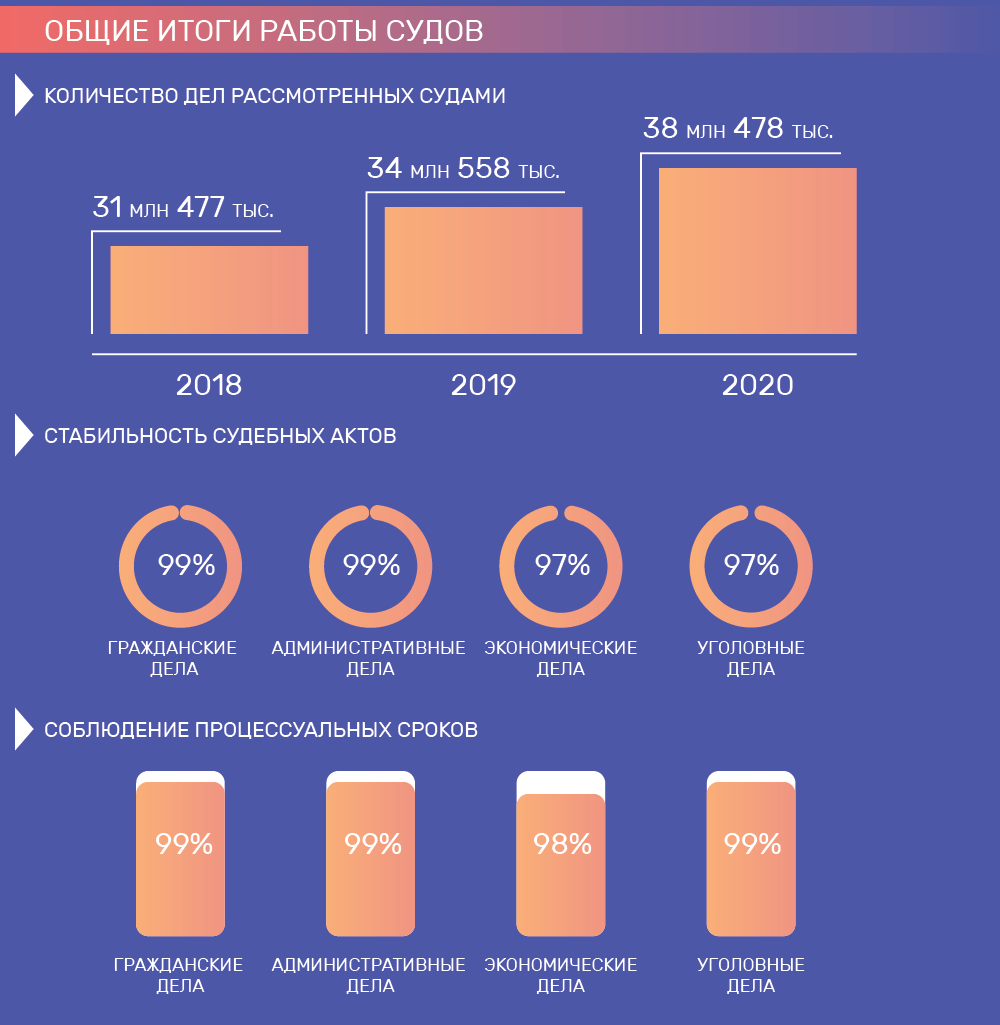 По словам Владимира Путина, который принял участие в совещании, в 2020 году российские суды не ограничились «программой минимум», а выбрали «программу максимум» и рассмотрели «практически все» обращения граждан, которые к ним поступили. 38,4 млн дел – столько рассмотрели суды в 2020 году. Это на 11% больше больше, чем было в 2019 году.
