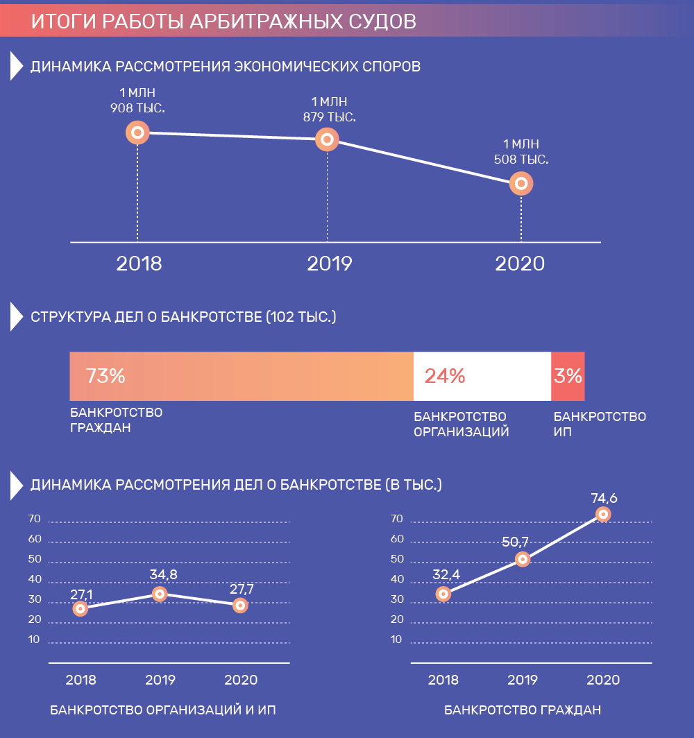 Арбитражные суды в 2020 году рассмотрели 1,5 млн споров. Это значительно меньше, чем в 2019 году – тогда их было 1,879 млн. Вероятно, это отчасти стоит объяснить пандемией и связанным с ней снижением экономической активности.