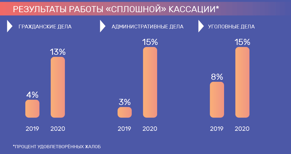 «Сплошная кассация», по словам Лебедева, показала свою эффективность: суды теперь удовлетворяют кассационные жалобы заявителей значительно чаще.