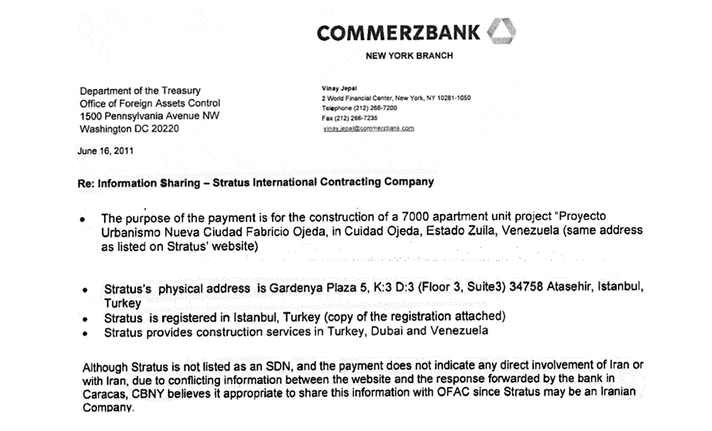 Как выяснилось, сокрытым доказательством было письмо нью-йоркского филиала Commerzbank о возможных связях Садра с Ираном в адрес OFAC на основании имевшейся у банка коммерческой информации.