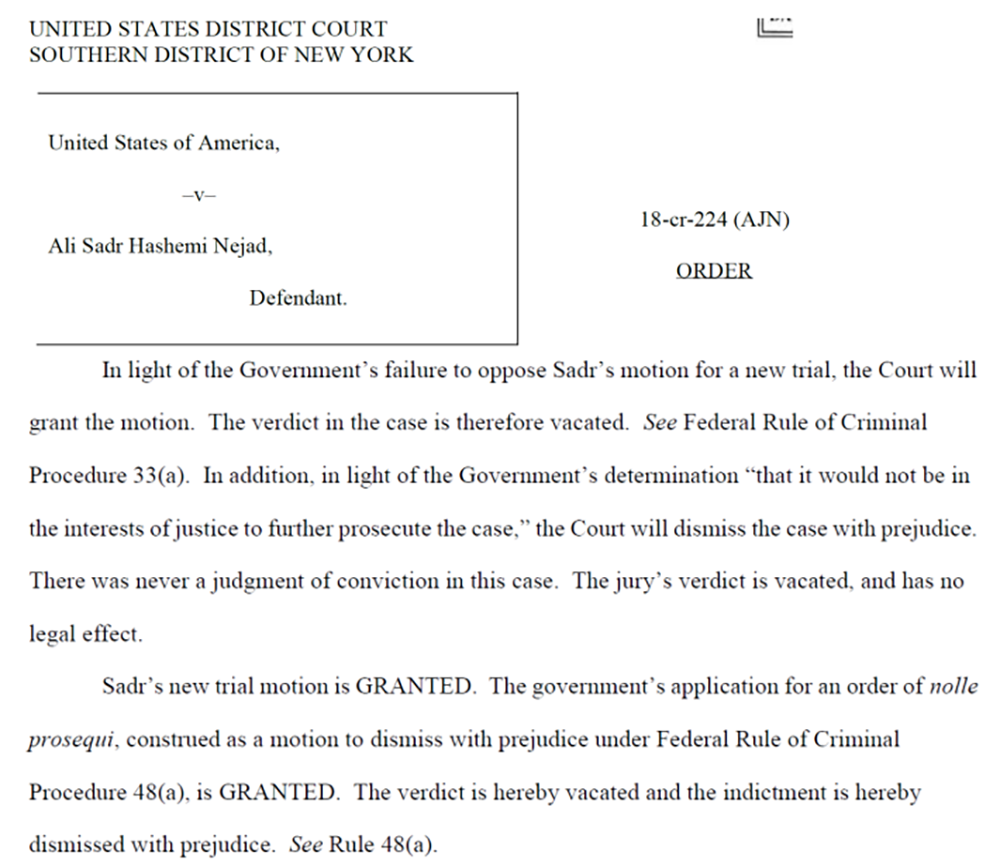 17 июля 2020 года Садр не только добился прекращения против него производства по делу с применением преюдиции и отменой вердикта жюри присяжных о признании виновным («…the Court will dismiss the case with prejudice. There was never a judgment of conviction in this case. The jury's verdict is vacated, and has no legal effect»), но и добился запуска нового процесса. Теперь суд будет рассматривать действия обвинения по сокрытию доказательств представителями обвинения.