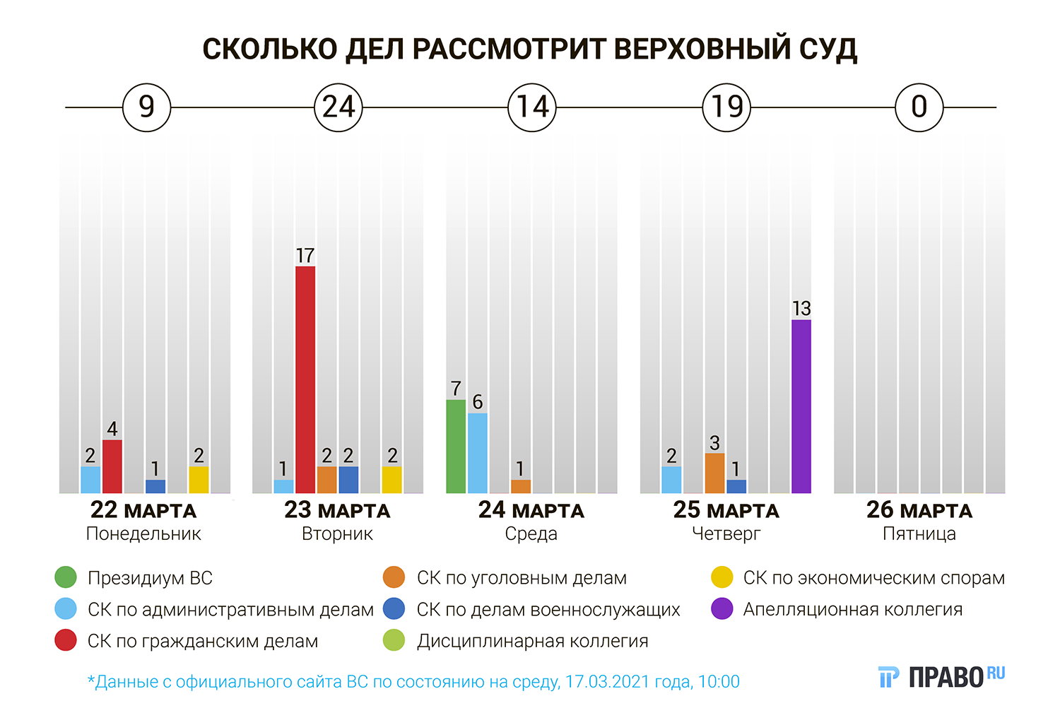 Почти треть от всех дел недели – 21 – в коллегии по гражданским делам.