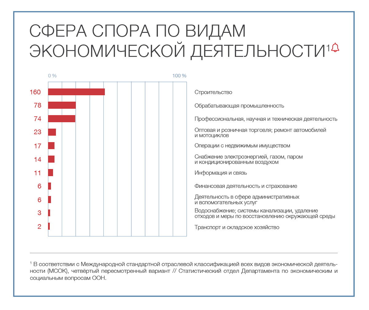 Что касается сфер спора по экономической деятельности, больше всего споров, более 40%, оказались связаны со строительством, на втором месте с примерно одинаковым показателем – обрабатывающая промышленность и профессиональная, научная и техническая деятельность.