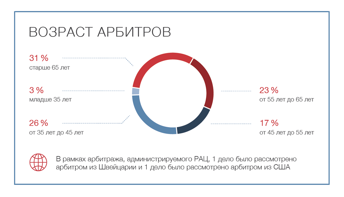 На сегодня в едином рекомендованном списке арбитров РАЦ – 120 человек. Центр изучил профессиональную принадлежность арбитров. Оказалось, что 41% из них – практикующие юристы (в прошлом году – 28%), 31% – представители науки, 20% – судьи в отставке. Изучили и возраст арбитров.