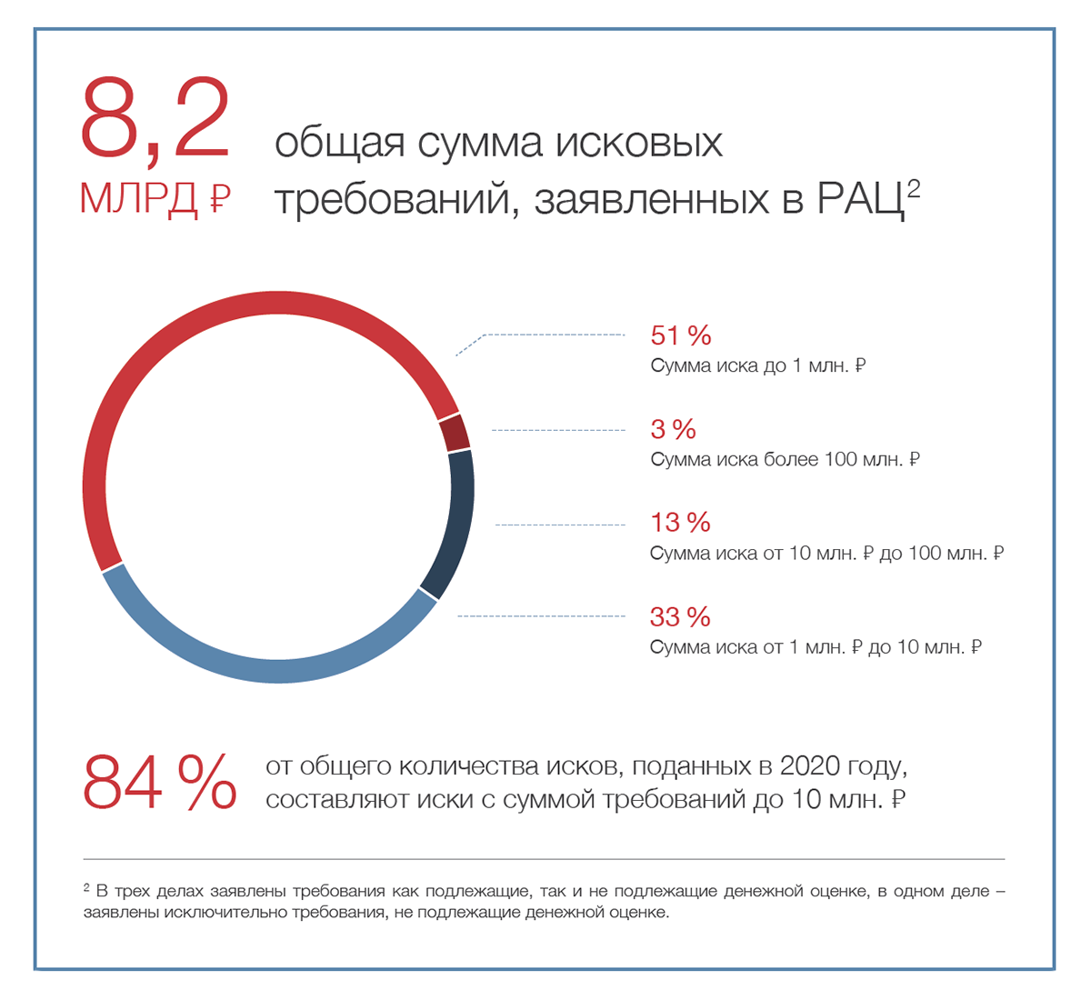 8,2 млрд руб. – общая сумма исковых требований, заявленных в РАЦ в прошлом году. Это чуть меньше, чем годом ранее: в 2019 году речь шла о 8,4 млрд руб. Большую часть, 84 % от общего количества исков, поданных в 2020 году, составляют иски с суммой требований до 10 млн руб., говорится в отчете арбитражного центра. В сравнении с прошлой статистикой, исков с меньшей суммой стало больше: в 2019 году дел с такой суммой требований было 78%.