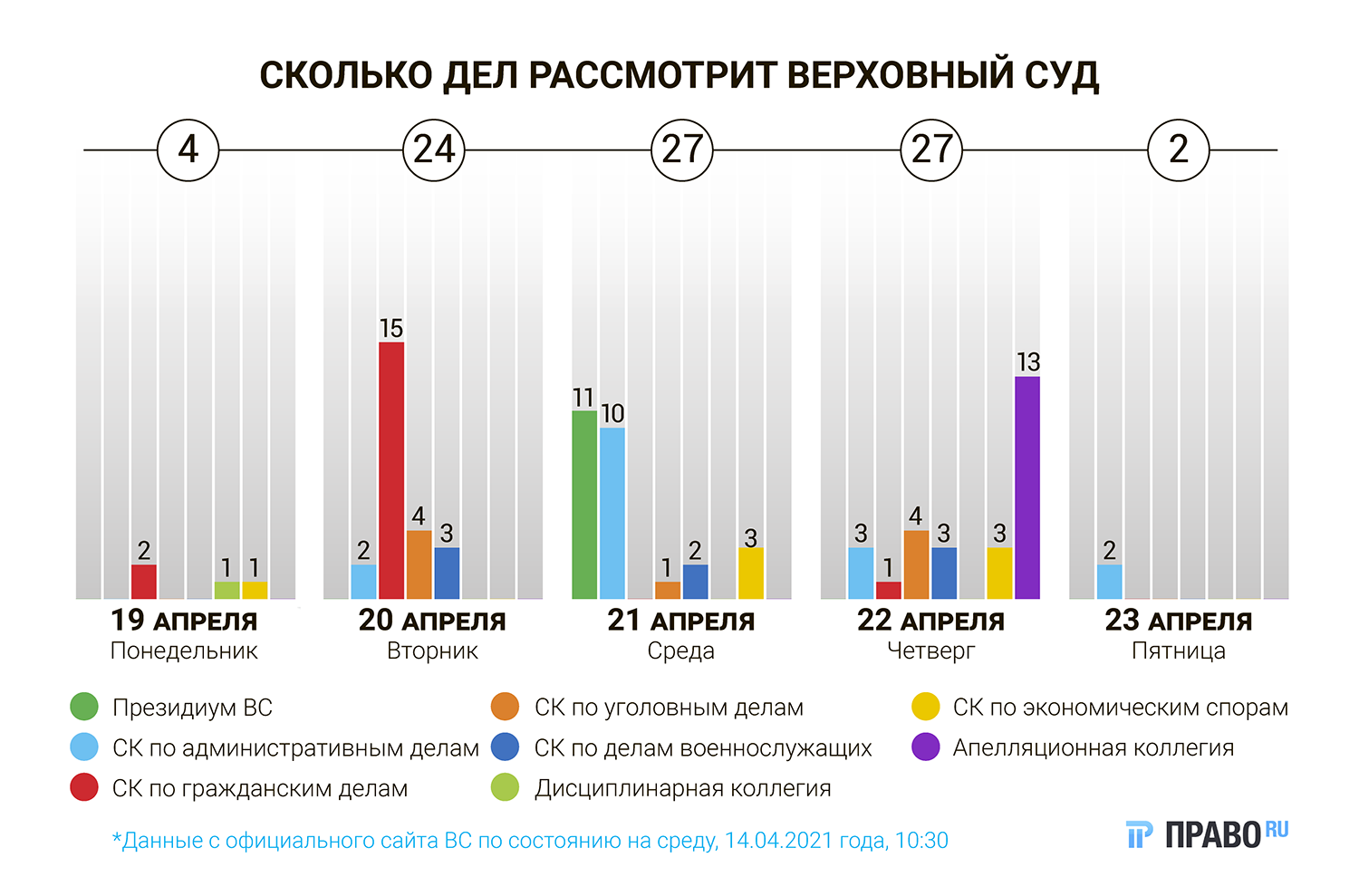 Президиум Верховного суда в среду, 21 апреля, рассмотрит 11 вопросов. Все они вернулись из ЕСПЧ. Дисциплинарная коллегия на неделе соберется только один раз. Светлана Волкова, судья Хасанского районного суда Приморского края, оспаривает лишение полномочий (№ ДК21-20). За что именно Волкову оставили без мантии, пока неизвестно. ККС Приморского края не опубликовала решение по ее делу.
