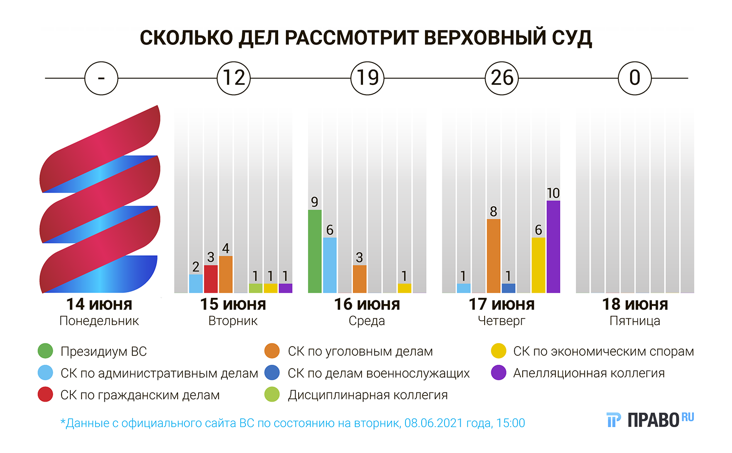 Дисциплинарная коллегия за четыре дня соберется только один раз. Во вторник, 15 июня, она рассмотрит дело экс-председателя Кропоткинского горсуда Краснодарского края Станислава Шестопалова (№ ДК21-41). Он обжалует в Верховном суде досрочное прекращение его судейских полномочий. По данным «Коммерсанта», региональная ККС лишила Шестопалова мантии в апреле этого года. Какой именно дисциплинарный проступок допустил судья, издание не уточняет.