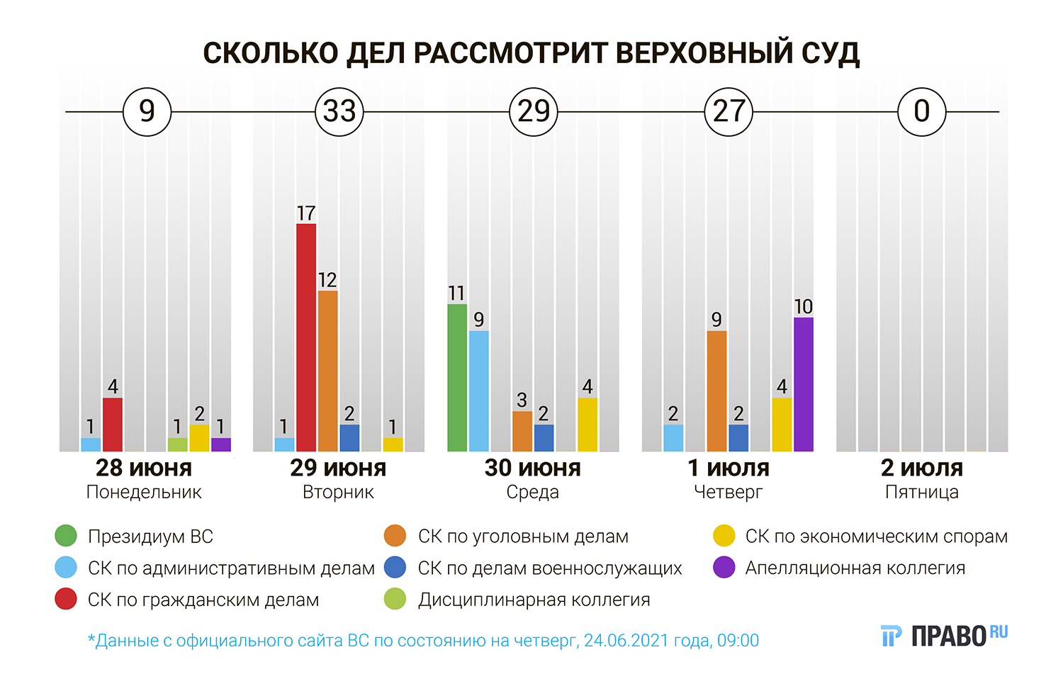 С 28 июня по 2 июля Верховный суд рассмотрит 98 дел. Дисциплинарная коллегия оценит жалобу судьи, который по дружбе заранее сообщал адвокату, кому смягчит меру пресечения. Экономколлегия разберется, надо ли погашать «текущие» налоги с залогового счета и исключать из конкурсной массы банкротящегося гражданина право требовать компенсацию морального вреда. А гражданской коллегии придется определиться, может ли выпускница медуниверситета не возвращать деньги за целевое обучение.