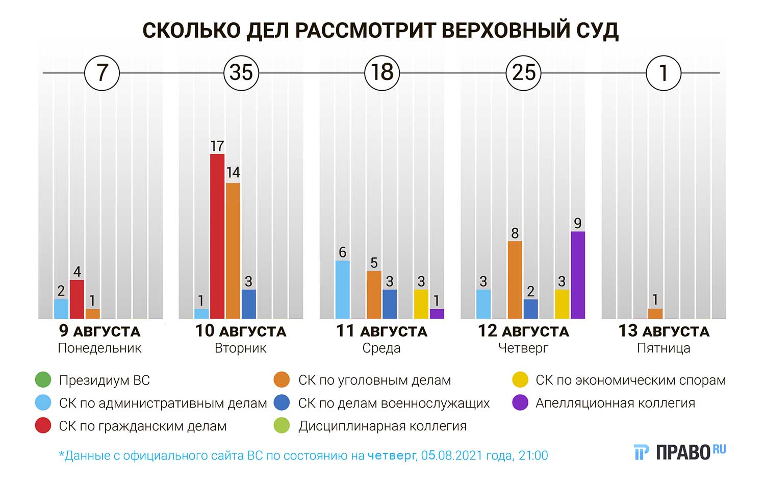 На неделе Президиум не соберется ни разу, равно как и Дисциплинарная коллегия. Коллегия по делам военнослужащих на неделе проведет восемь заседаний.