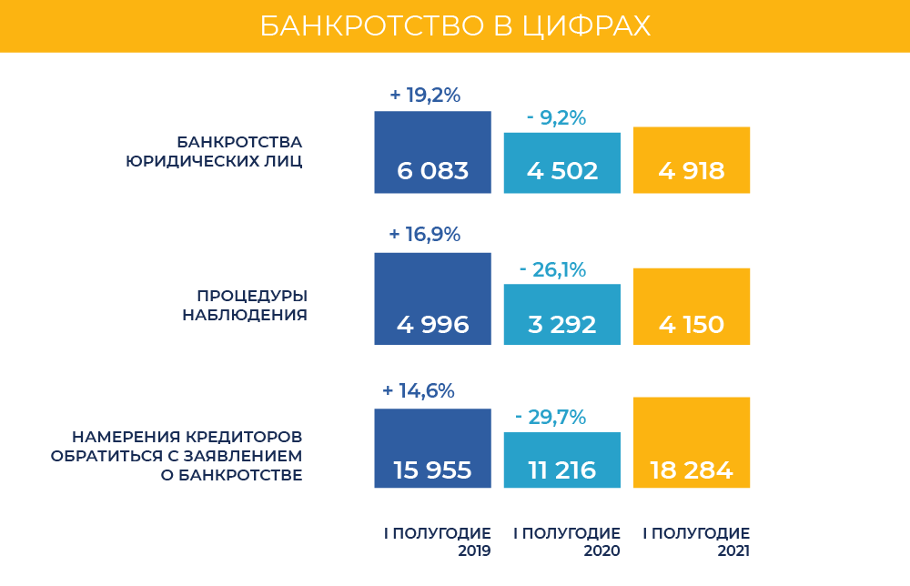Как следует из статистики Федресурса, в первом полугодии 2021 года количество корпоративных банкротств выросло на 9,2%, но снизилось на 19,2% к аналогичному периоду доковидного 2019 года. Число введенных судами процедур наблюдения за первую половину 2021 года выросло на 26,1% к половине 2020-го, но все так же сократилось на 16,9% к этому же периоду 2019.