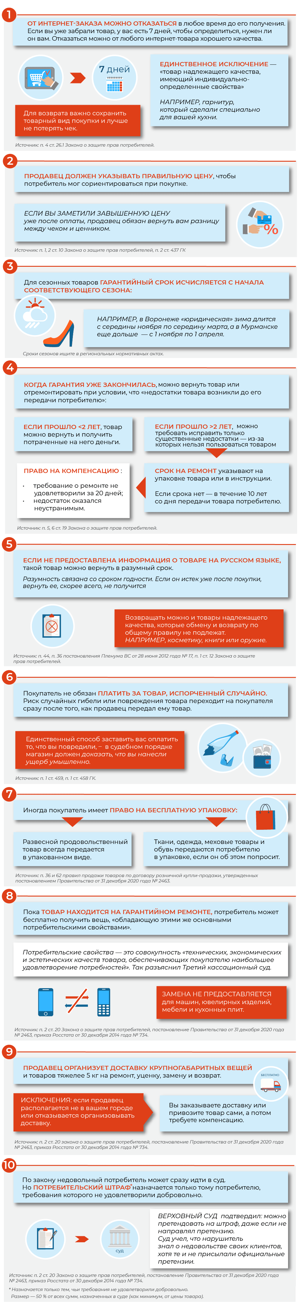 Хочется больше деталей? Тогда вот бонус для тех, кто дочитывает до конца: «Вернуть безвозвратное: 10 лайфхаков для потребителя» — текстовая версия этой же статьи. Основная информация та же самая, но больше ссылок на законы. А еще веселые истории из судебной практики и «потребительской» жизни нашего корреспондента.