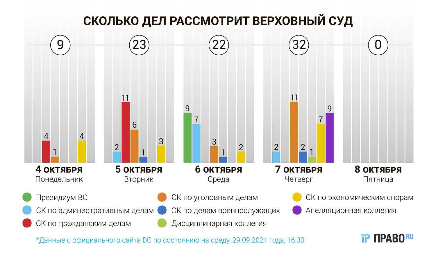 На неделе с 4 по 8 октября Верховный суд рассмотрит 86 дел. Коллегия по гражданским делам решит, нужно ли возместить заявителю расходы на юриста, которого наняли для дела об административном правонарушении с истекшими сроками. В экономколлегии разъяснят сроки давности по антимонопольному делу, ответят на вопрос о допустимости судебной неустойки в споре с чиновниками и дадут оценку поведению управляющего, который без необходимости распродал все имущество должника. Ставропольский судья просит не отдавать его следователям по делу о мошенничестве, а родственники повесившегося судьи из Омска добиваются отмены посмертного приговора.