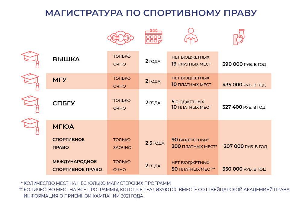 Вариант со «спортивной» магистратурой обычно выбирают молодые специалисты. Такие программы есть в крупных вузах Москвы и Питера — НИУ ВШЭ, МГУ, МГЮА, Институте законодательства и сравнительного правоведения при Правительстве РФ, СПбГУ. В регионах «спортивных» магистратур практически нет. Нам удалось найти только одну — «Правовое обеспечение в сфере физической культуры и спорта» в Уральском государственном университете физкультуры. Правда, она ориентирована на «абитуриентов из стран ближнего и дальнего зарубежья» и дает знания о международных спортивных отношениях.