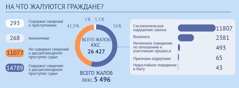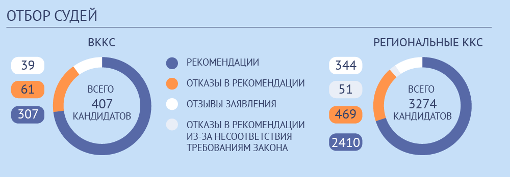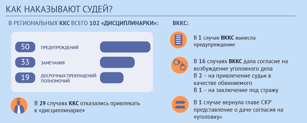 За первое полугодие ВККС прекратила полномочия 86 судей и председателей судов. Абсолютное большинство — 80 человек — попросили об этом сами. В остальных шести случаях речь шла об объективных причинах: смерти или неспособности по состоянию здоровья исполнять «судейские» обязанности. Региональные ККС за этот же период прекратили полномочия 846 судей и руководителей судов. В подавляющем большинстве случаев (827) это произошло на основании заявления об отставке или по другим уважительным причинам. Но 19 судей лишились своих полномочий за дисциплинарные проступки.