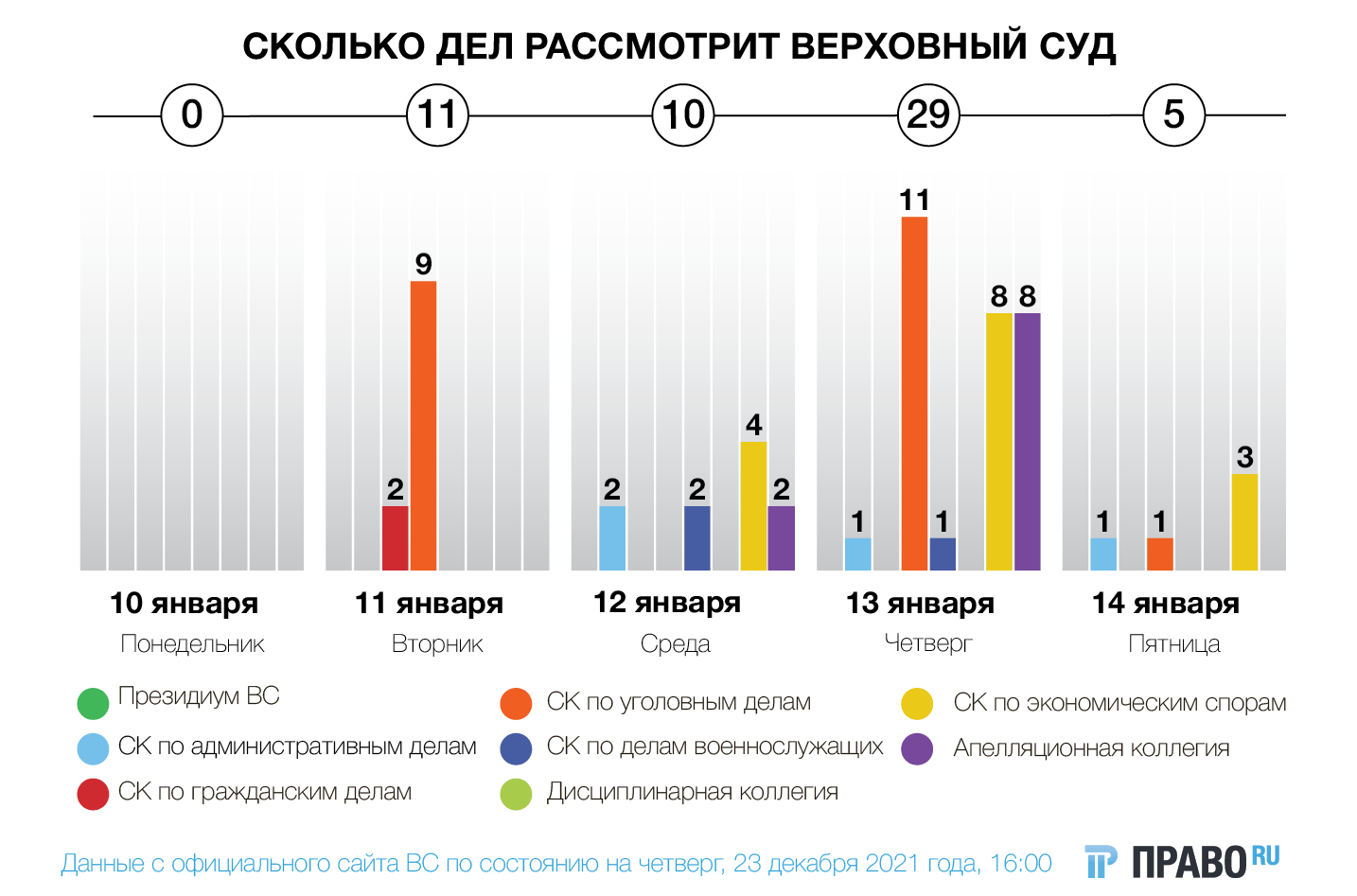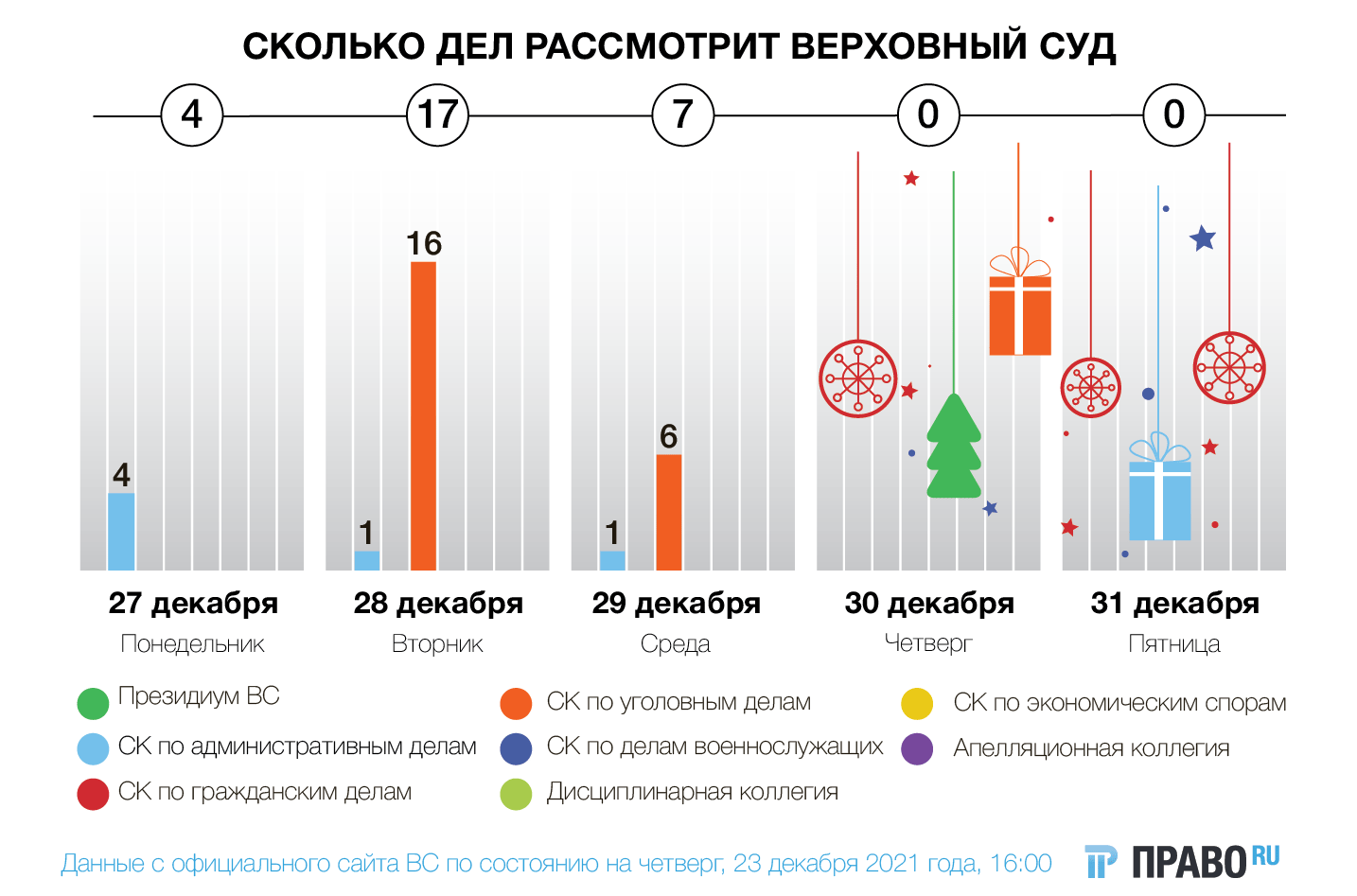 На последней неделе 2021 года Верховный суд рассмотрит 28 споров. Президиум ВС собираться не будет, дел не назначено в дисциплинарной коллегии, экономколлегии и коллегии по гражданским делам.