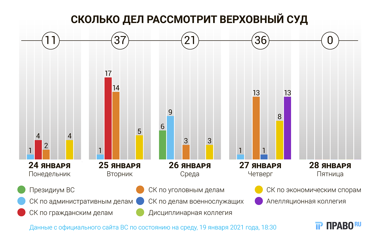 В четвертую неделю января Верховный суд рассмотрит больше ста дел. Экономколлегия разберется, уведомили ли надлежащим образом арбитражного управляющего о заседании, на котором ее дисквалифицировали на полгода, и разъяснит возможность солидарного взыскания убытков с нескольких ответчиков. Коллегия по гражданским делам решит судьбу квартиры, у которой не было законных наследников, но был покупатель. А админколлегия рассмотрит жалобу судьи, который, как считает следствие, заплатил 1,5 млн руб. мужчине, чтобы тот взял на себя вину за смертельное ДТП.