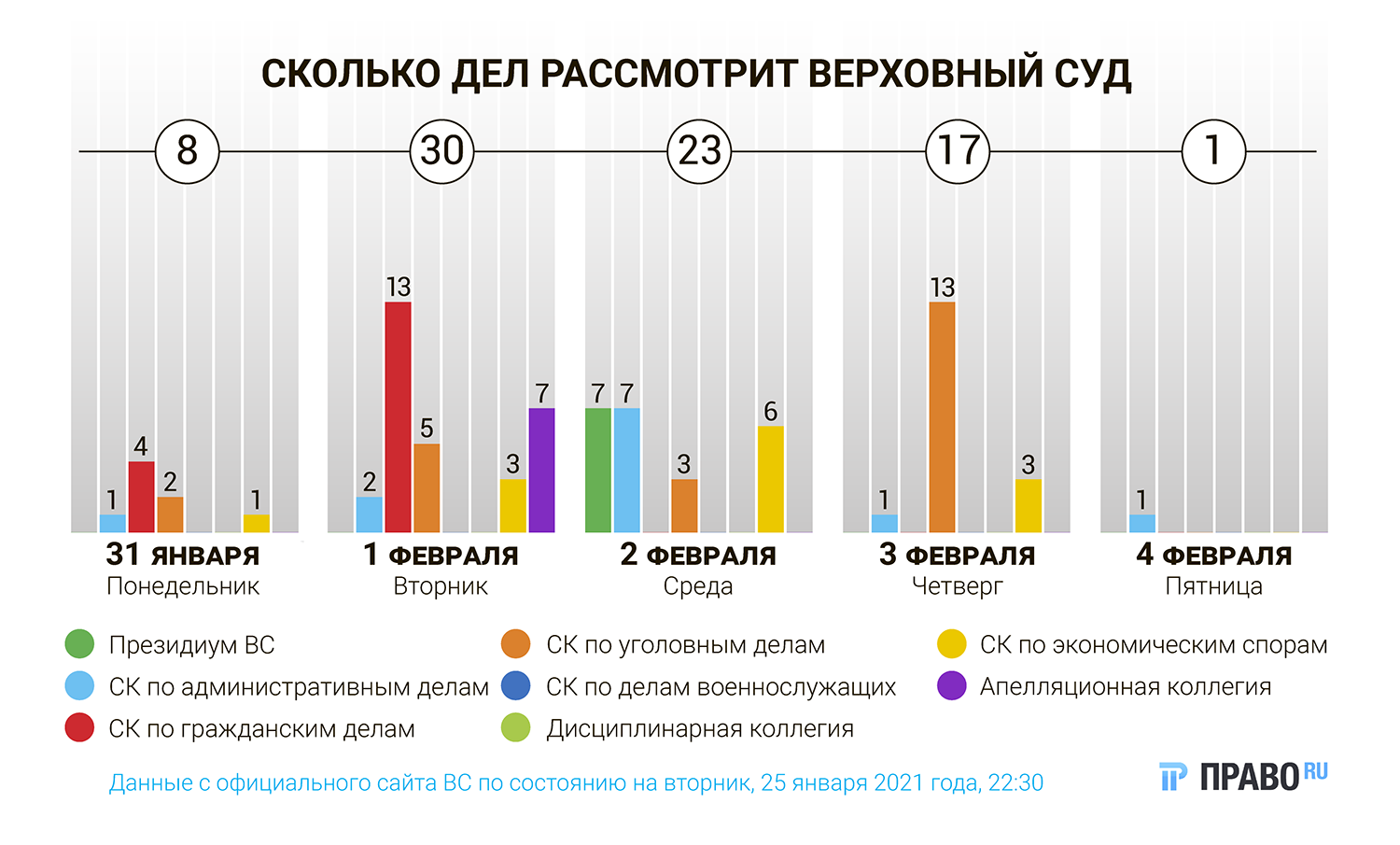 На новой неделе Верховный суд рассмотрит 83 дела. Коллегия по гражданским делам разберется в споре о перепланировке многоквартирного дома и объяснит, нужно ли для этого согласие всех жильцов. Экономколлегия разберется, продолжал ли действовать истекший договор аренды и стали ли поручительские сделки причиной бедствия нефтяной компании. Апелляционная коллегия рассмотрит жалобу судьи, которого обвиняют в получении сексуальных услуг у несовершеннолетней, а в админколлегию пожаловался судья-отставник, которого лишили «пенсии» за работу юрисконсультом.